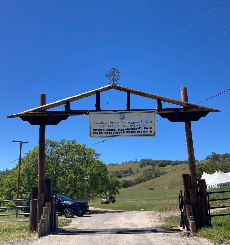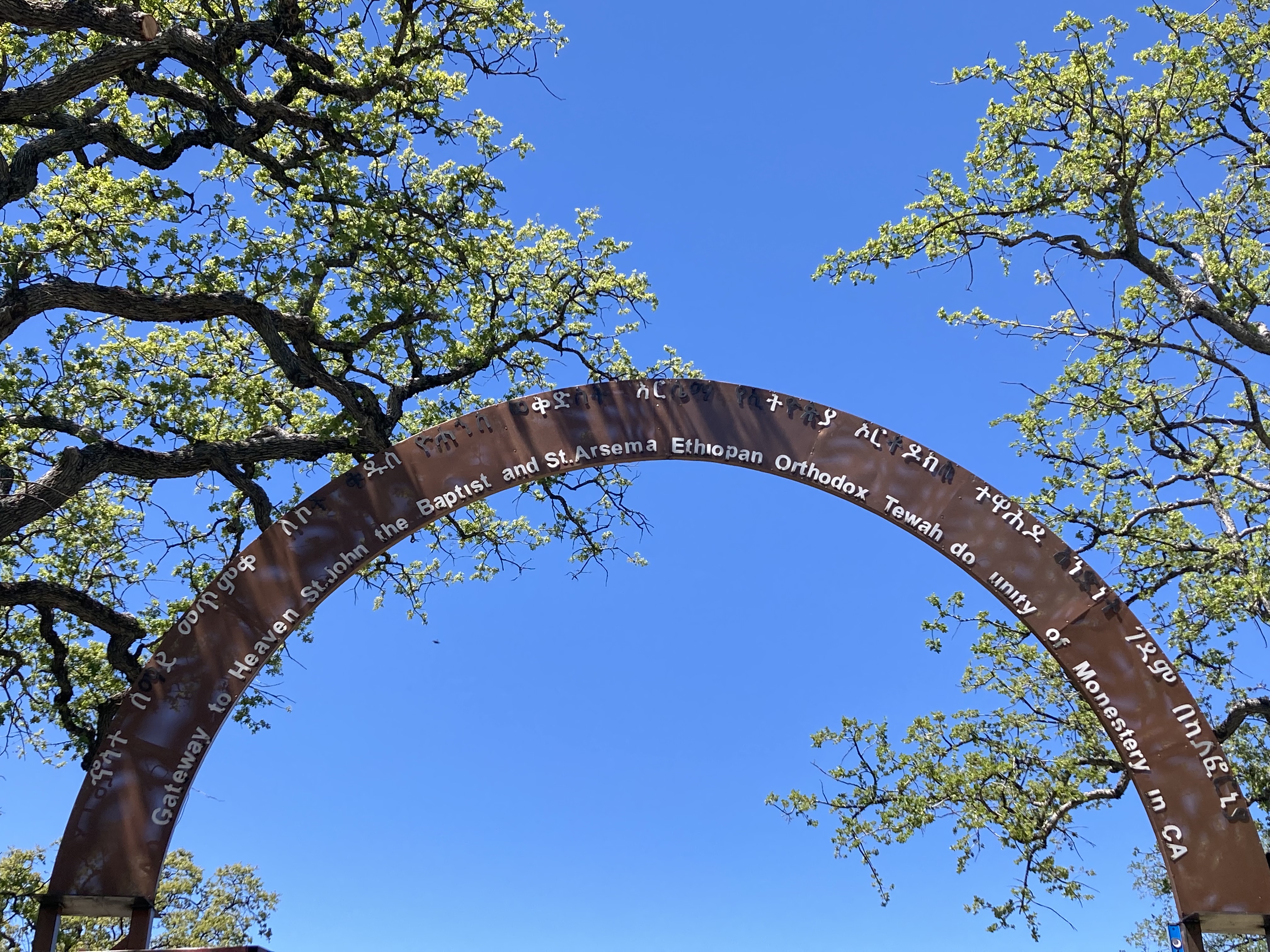 Eventually we found the place. We could tell by the cluster of men busy repairing the front gate. They were erecting a metal arch carrying the words: “Gateway to Heaven St. John the Baptist and St. Arsema Ethiopan Orthodox Tewah do unity of Monestery in CA.” The spelling wasn’t perfect, and the lettering had some issues, but it looked like this was actually a last-minute replacement for the former gate, which lay crumpled on the ground nearby. It must have been knocked over by heavy winds in the recent past.