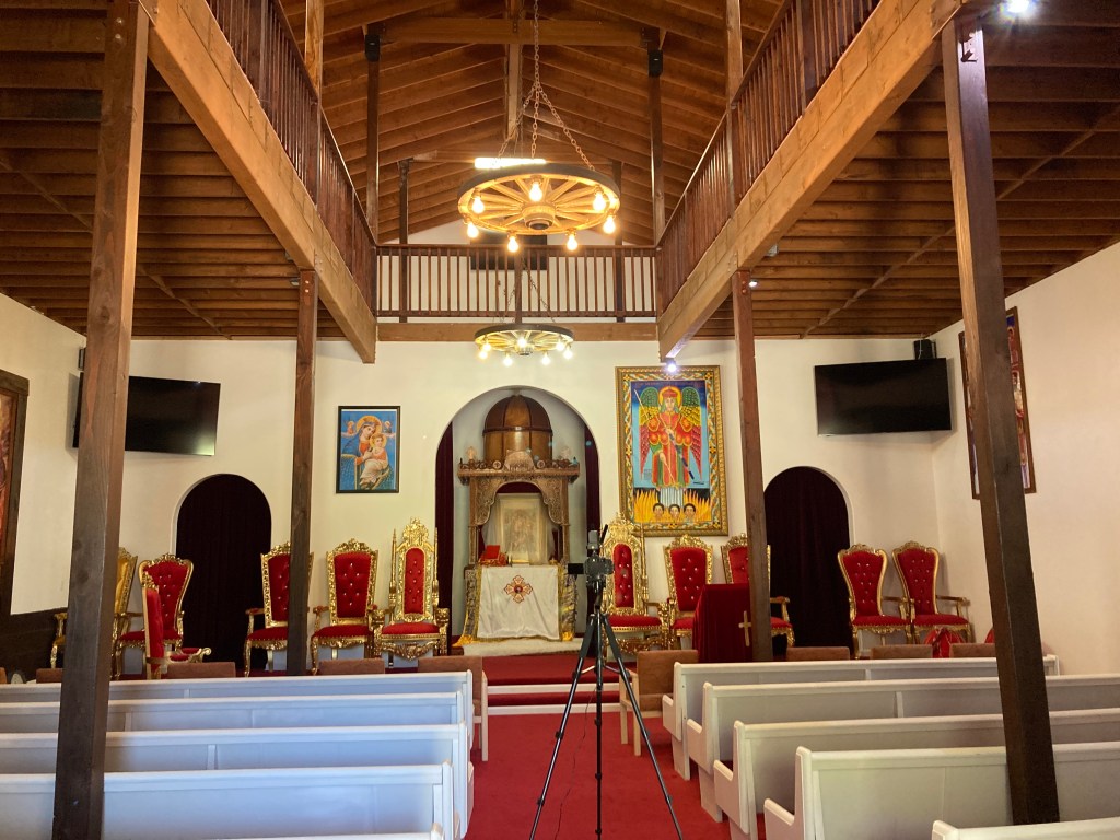 We continued along the road, which wound tightly between more hills before opening onto a vast field. Some massive tents had been set up in the field and there was a large barn to our right. Many people were buzzing around, finishing various tasks to get the place ready for visitors. We parked the truck and wandered a bit, discovering that the inside of the barn had been converted to a fine church, with a large overflow room and a second story viewing platform. There were 10 golden chairs set out along the stage in front of the Holy of Holies, presumably where the Bishops would sit during the service.