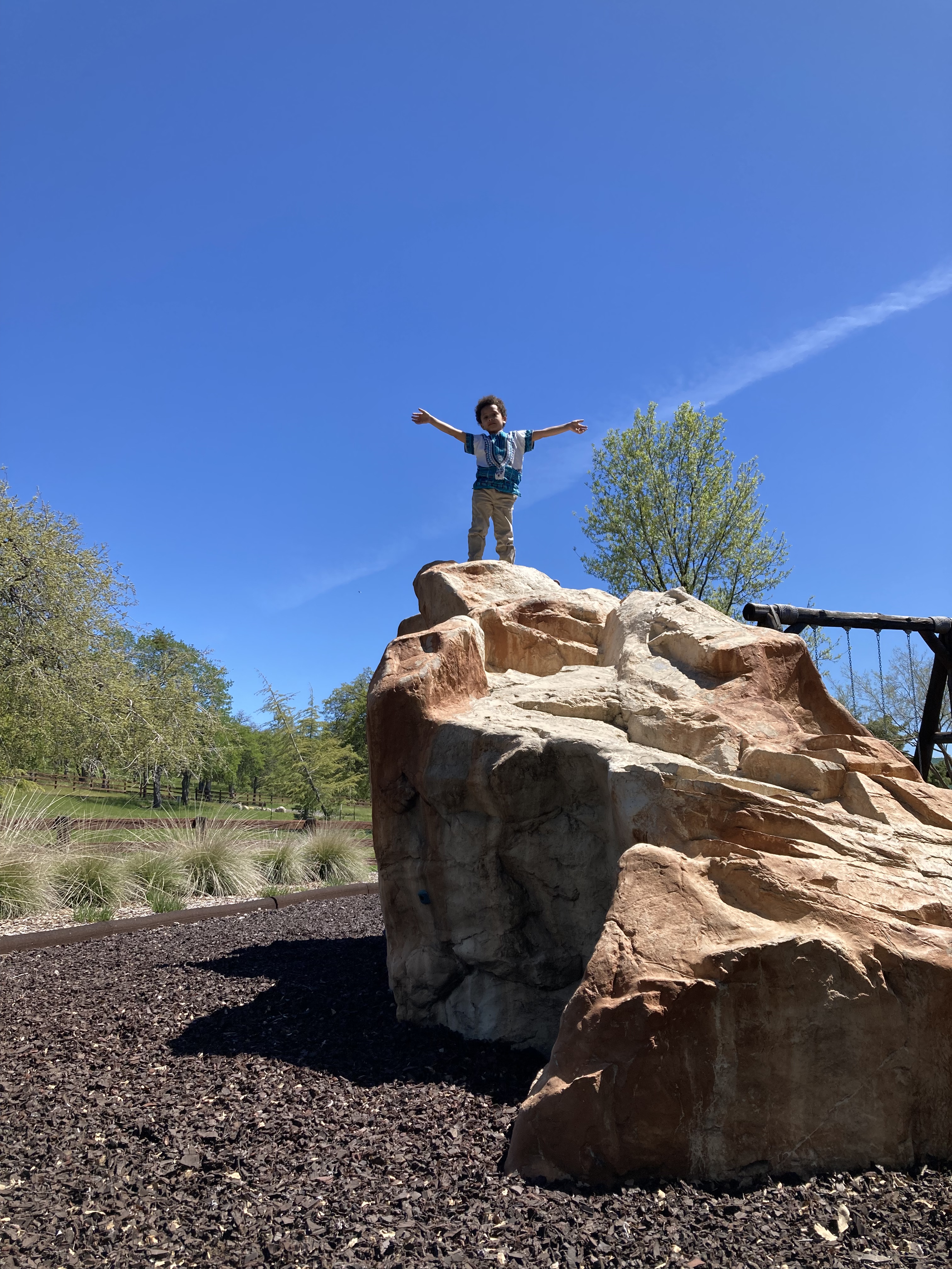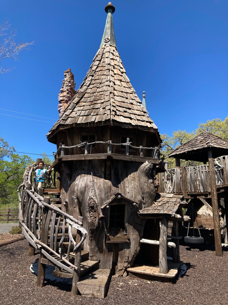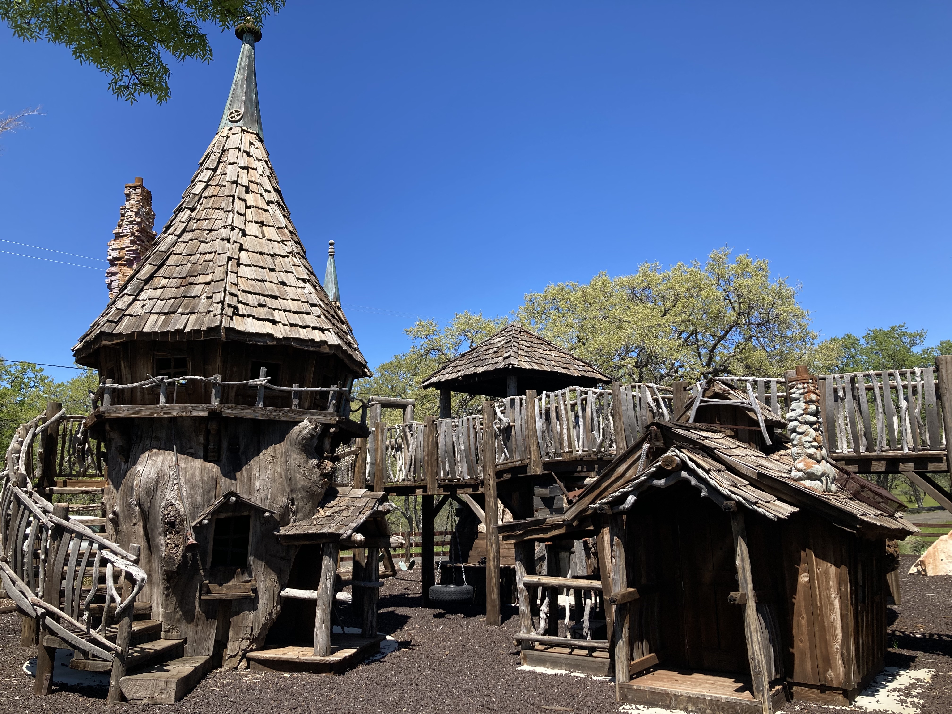 Other than construction, there was nothing happening here yet, so we returned to the main building. I let Nathan run around and play on the playground, which featured elaborate treehouses and huts in the theme of a “pioneer village” of woodland creatures. There was owl’s house and rabbit’s house, the beaver’s house was a sawmill. That kind of thing.