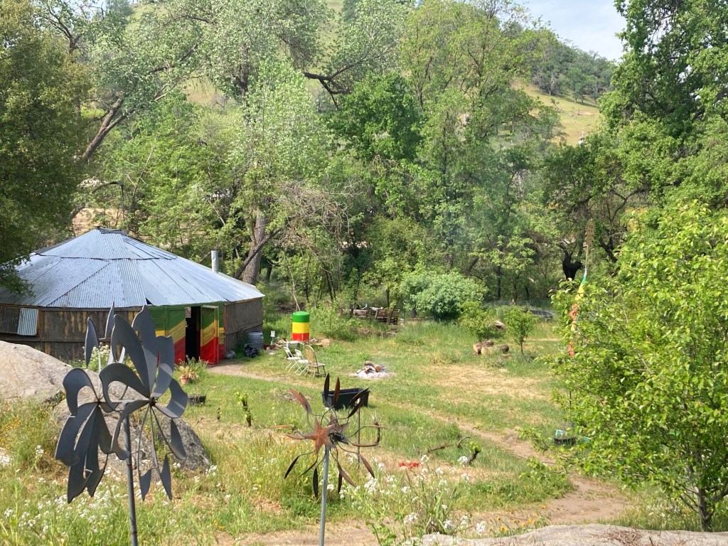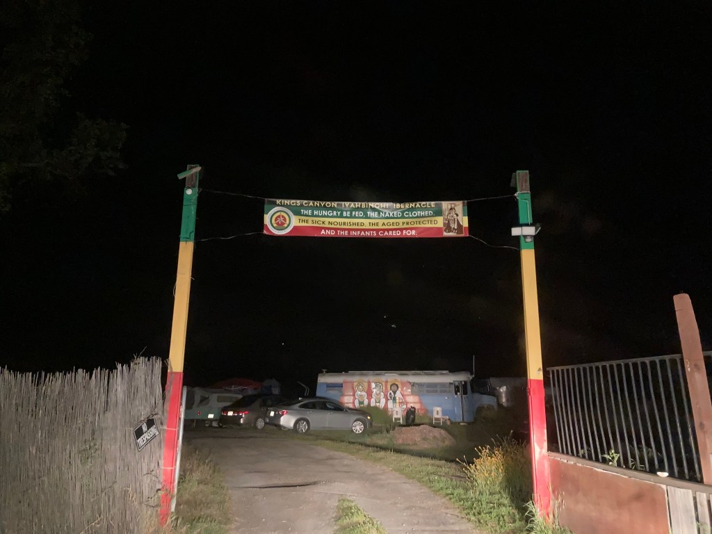 We left Orange Cove and entered a new winding mountain road into deeper and deeper territory, but these was not the same kind of road as before. More of a shire full of sleeping Hobbits, these hills were gentler, with more homes and habitations, signs of many rural agricultural people around. Before long, we saw the green, gold, and red of the Ethiopian flags and painted gate posts. We had reached the King’s Canyon Nyahbinghi Tabernacle.