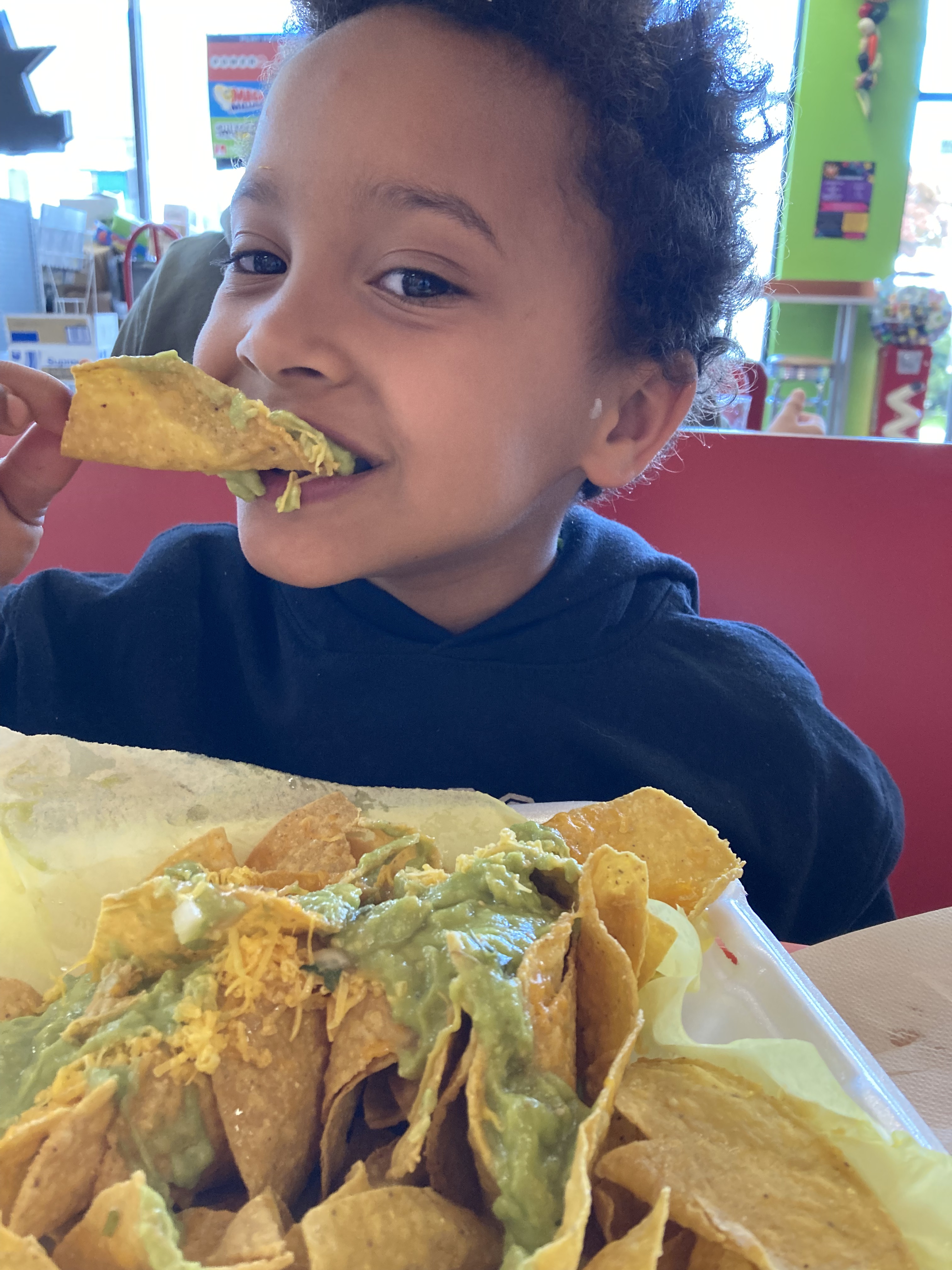We stopped several times for Nathan to pee, and a couple of times to fill up the gas tank, a couple times for snacks, and only once to eat a sit-down meal. That was a lunch of nachos for Nate, and tamales (maybe?) for me, things that would travel well, and the leftovers served for dinner on the road.