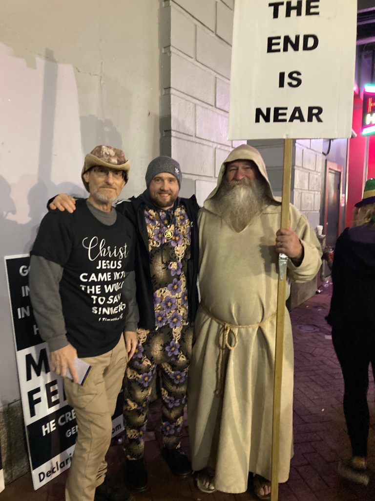 Then we turned the corner from Canal onto Bourbon and saw the guys with the signs and the microphones. This time I stopped and walked over to the speaker. I told him I was confused about what he was saying and I wanted to ask him some questions. At first, he played nice. He announced that he had someone here named Nic who wanted to ask some questions and so we’d turn this into a Q&A format discussion for a while, for the benefit of all the passers by. But, I think it was only the first or second answer and I was already confused. The thing is, these guys had their own particular vocabulary they were using, phrases that sounded unfamiliar to me even as a Church-going Orthodox Christian. It was like they had their own completely different tradition of translating, thinking, writing, and talking about the Bible (which they do). I asked him a clarifying question, “What do you mean when you say ‘Traditions of Men’? I mean, reading and writing and giving our children names is a tradition of men, so how could all the traditions of men be condemned?” He didn’t take that very well and now it became a confrontation. We continued to talk, I had more questions, he had more answers, but now the whole tone of it was angry and adversarial. It wasn’t fun. Chelly got angry and walked away. I couldn’t disengage, I mean, maybe I was trying to “win” an argument, maybe I just wanted to calm things down and be on a friendly basis with this guy. It was a confused mix of emotions and motivations.