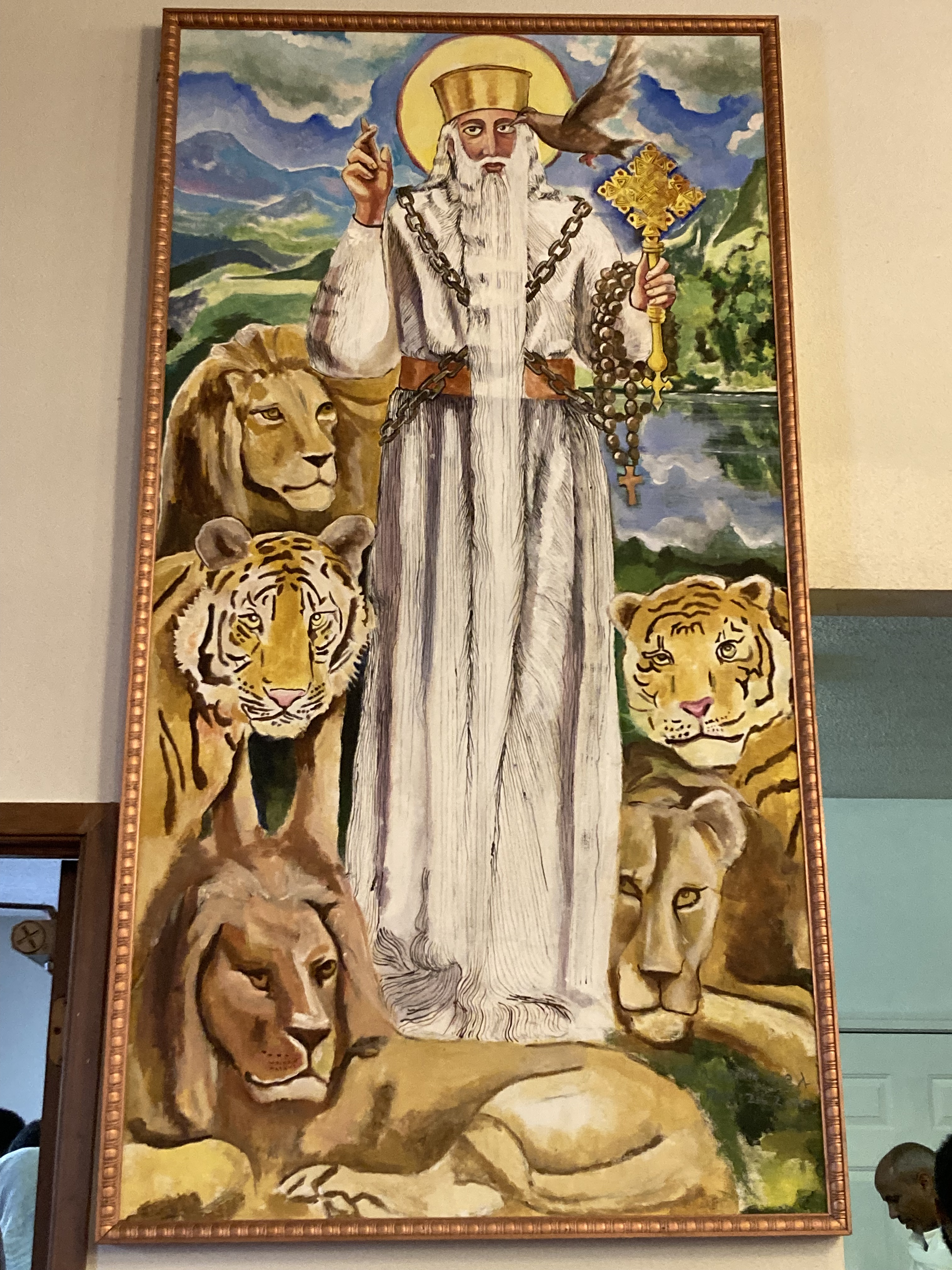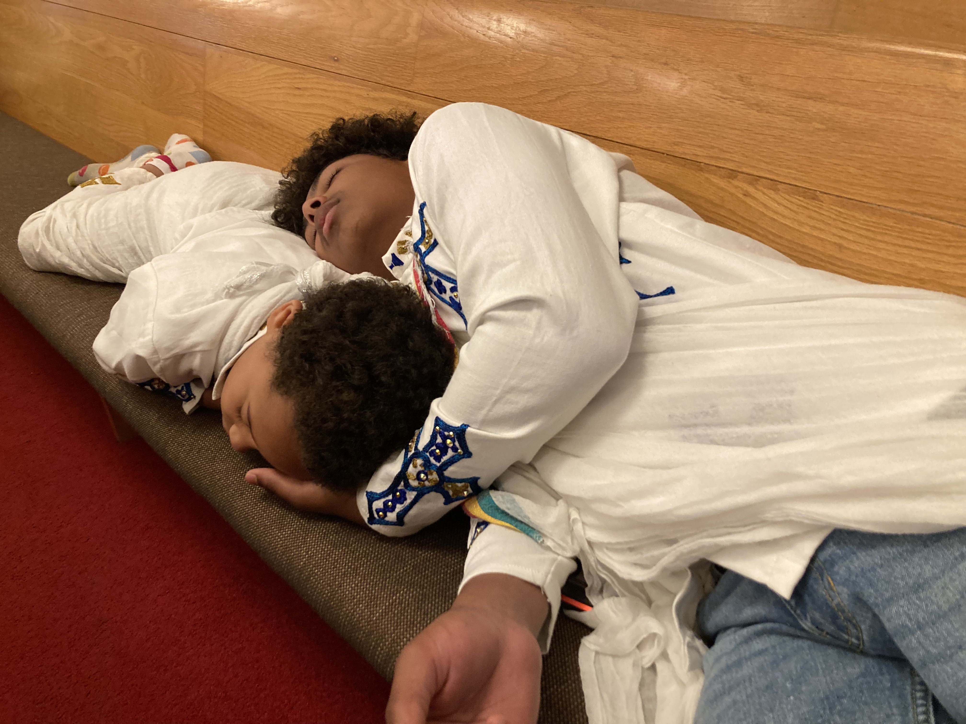 This part is beautiful, but it is also strenuous. Those fasting, or tired, or inexperienced may find themselves sitting down for a while to rest. This is also the part where children fall asleep. And mine did, cuddled up on a pew together in their white shawls. I did too, I have to confess. Looking around the men’s side of the room at various points, I noticed that virtually all of the fathers who had traveled down from Seattle with their families also fell asleep during one part of the service or another. And there is no shame in that. As one of the Ethiopians told me once, the Church is your Mother, and as you slept in your Mother’s womb, you can also sleep in the Church. But we all woke up for the Communion.