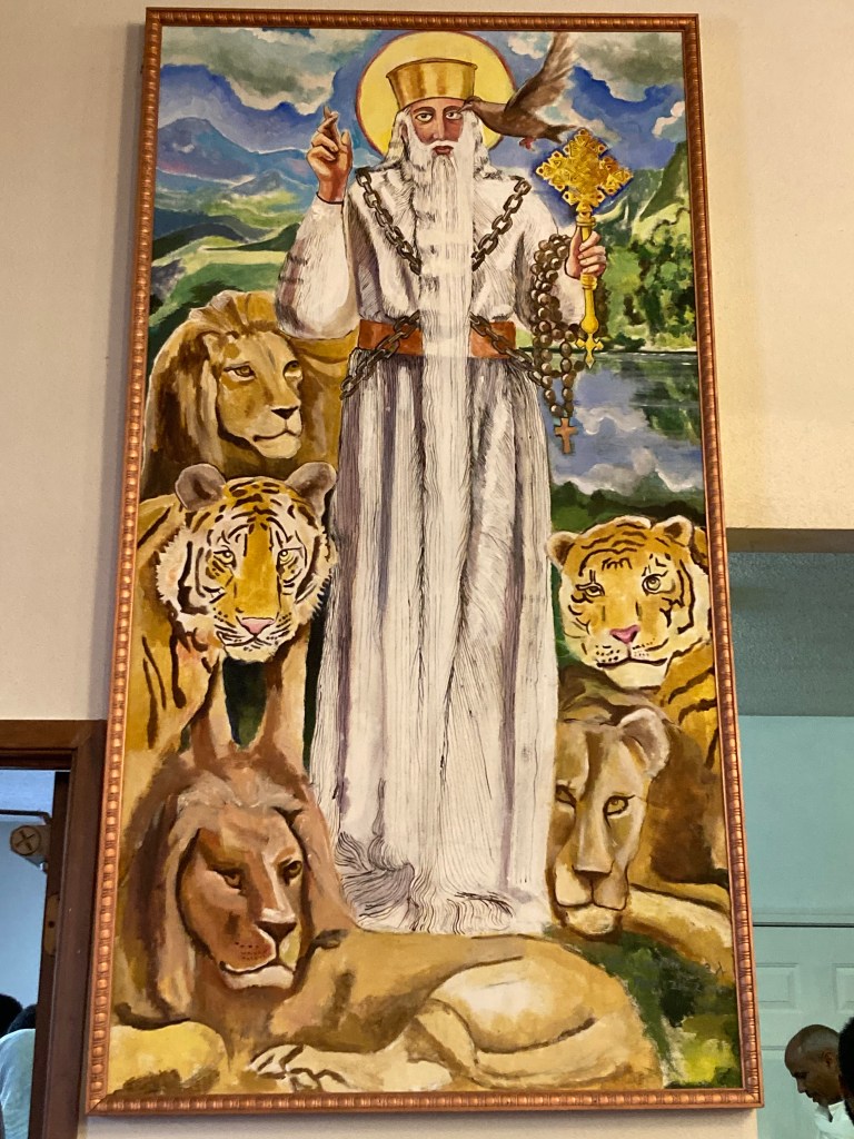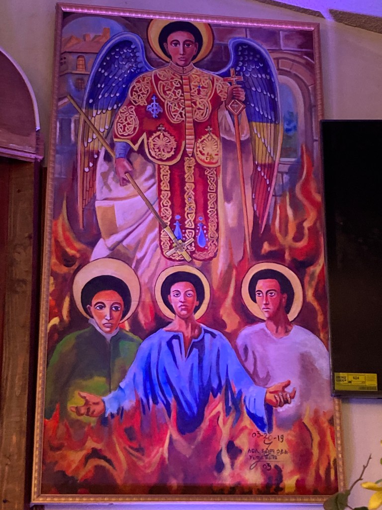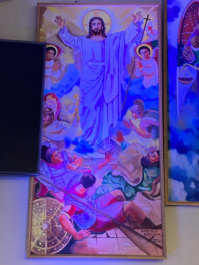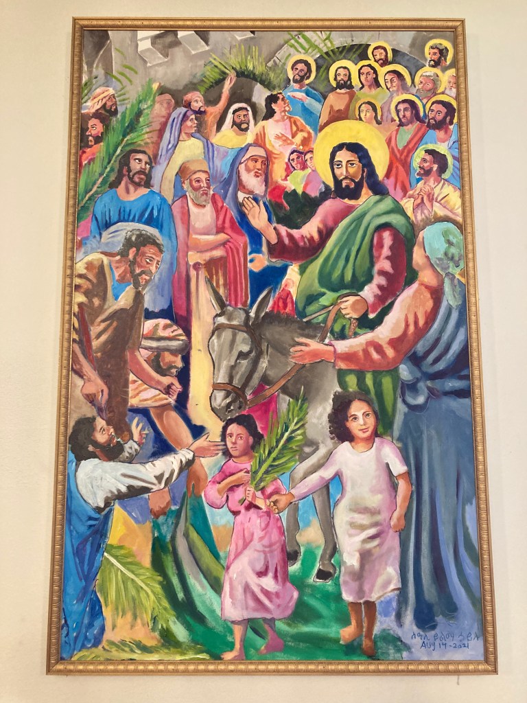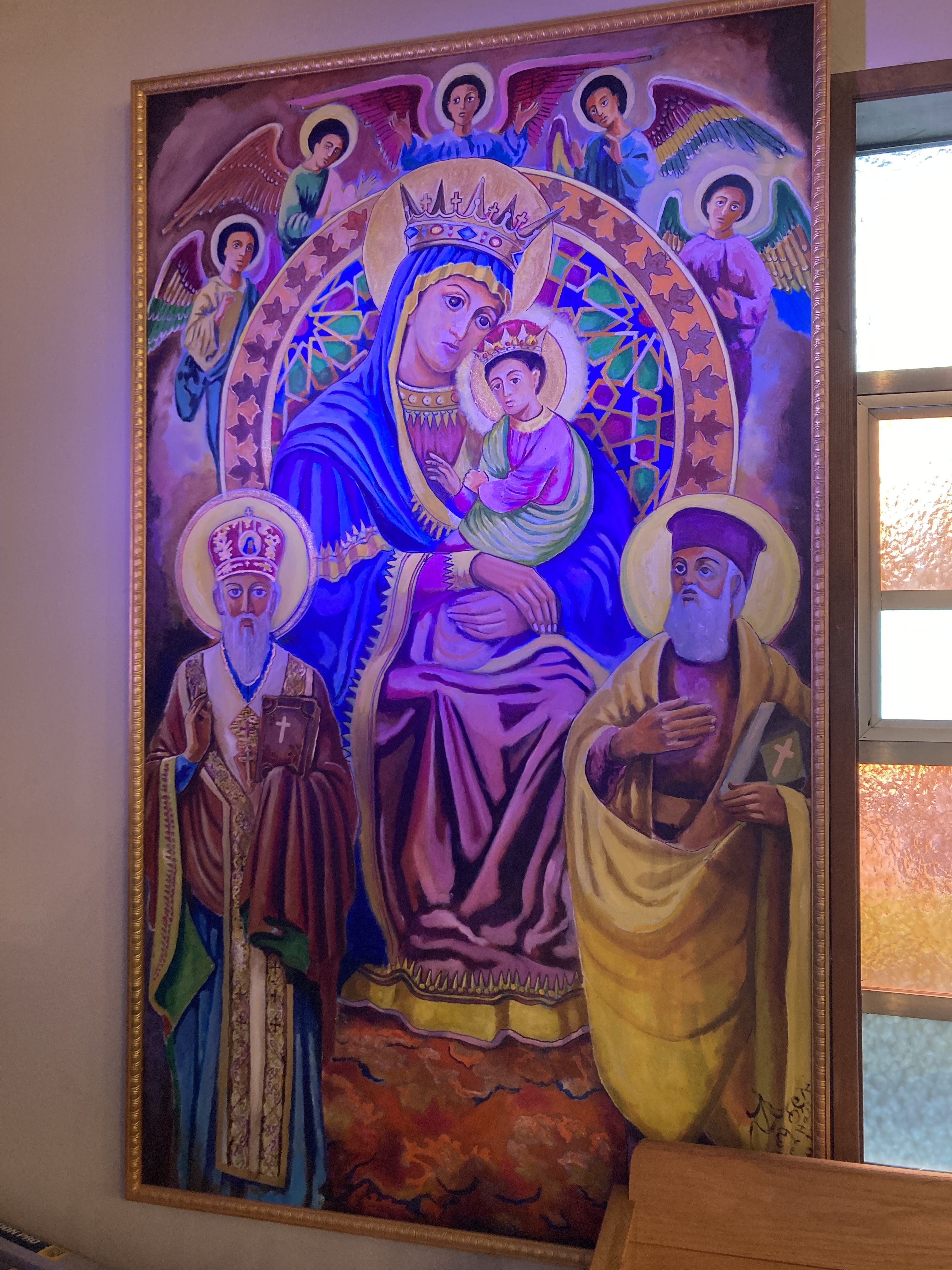 For an absurdly long time, the bride and groom stood at the front of the church before the iconostasis (the wall of icons) as groups of 2 or 4 or 10 came up to pose for photos with them. This part took forever! But, it was so joyful, as everyone wanted their turn–at least once–to pose and smile with the happy couple. I got in there for a couple pictures, and also took this time to take photos of the gorgeously painted icons ringing the room. These were all done by a painter called Yilma Hailu, who paints in a style quite distinct from what I’ve seen before in Ethiopian churches. These were much more naturalistic and almost impressionist in their use of textures, light, and shadow, differing greatly from the flat, traditional style I’m used to.