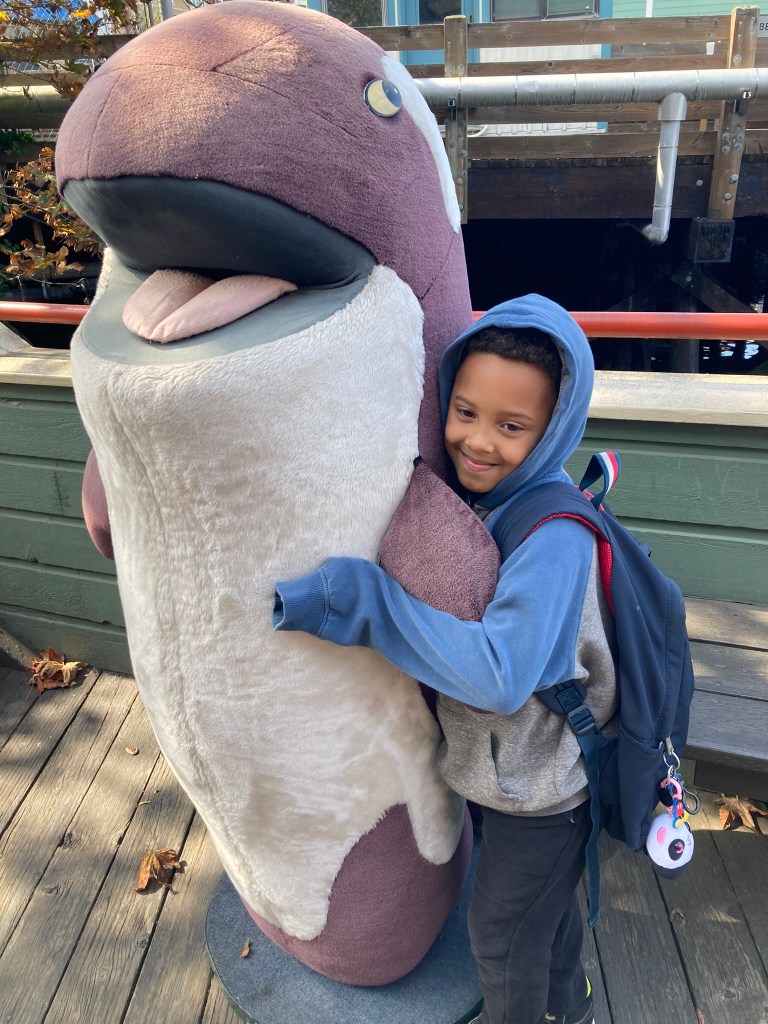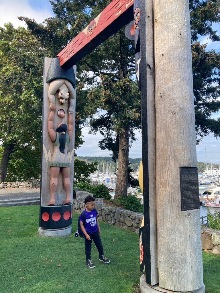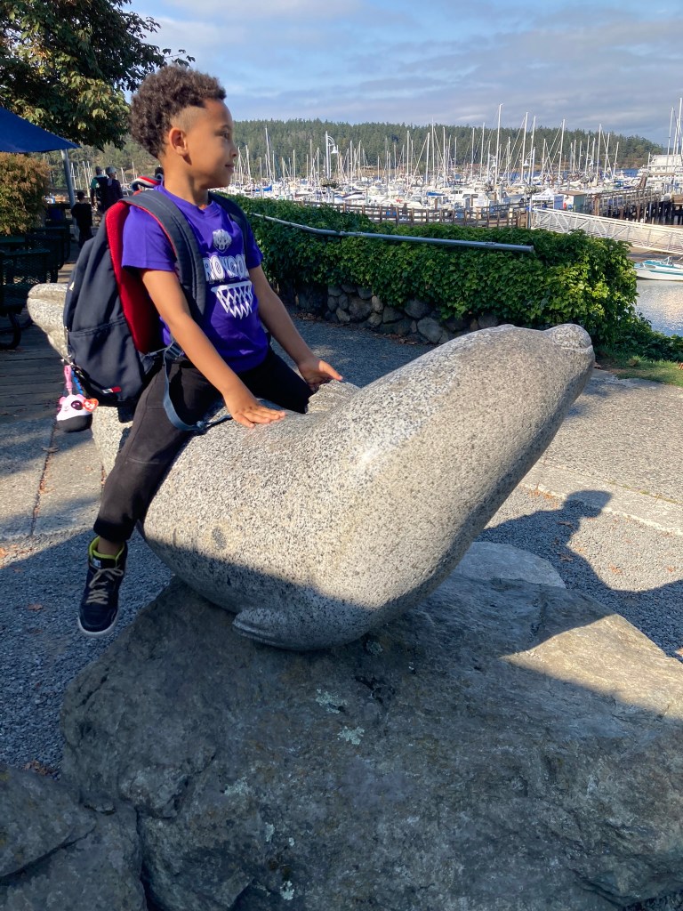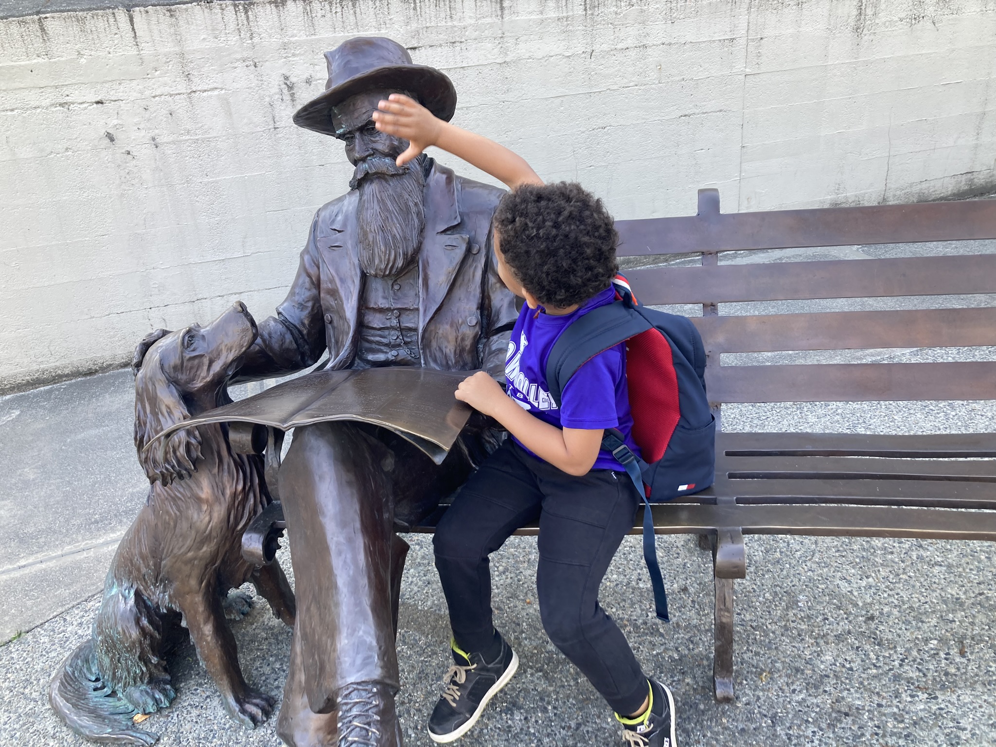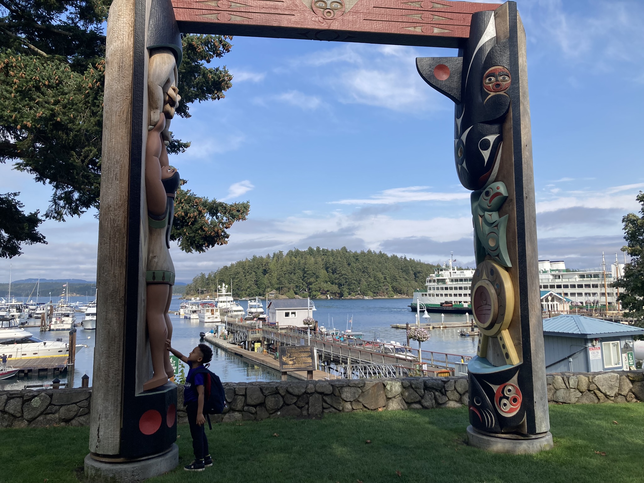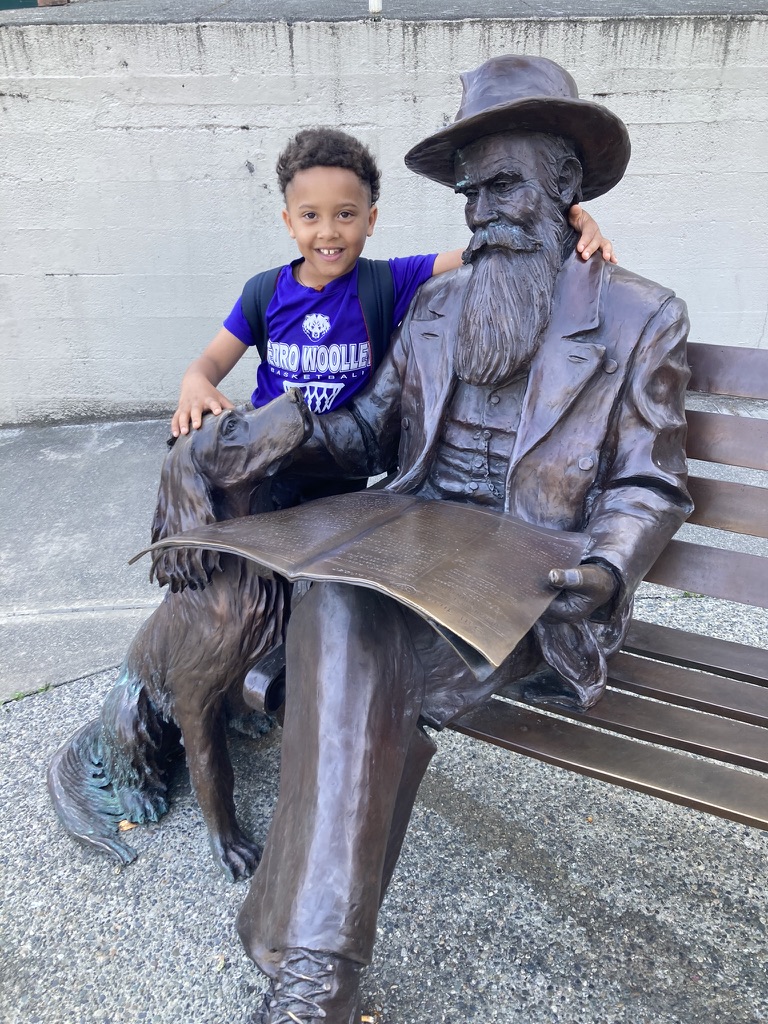 The boat reached Friday Harbor and there it was: the glorious, shining sun. We walked off before the cars and wandered through the pleasant harbor town with it’s marinas full of sailboats and pleasure yachts. Nathan found the sculpture of a harbor seal who the locals all used to know and love, as well as a beautiful Coast Salish totem arch. Deeper into town, he found a bronze statue of the town’s founder, seated on a bench with his favorite dog, reading the paper.