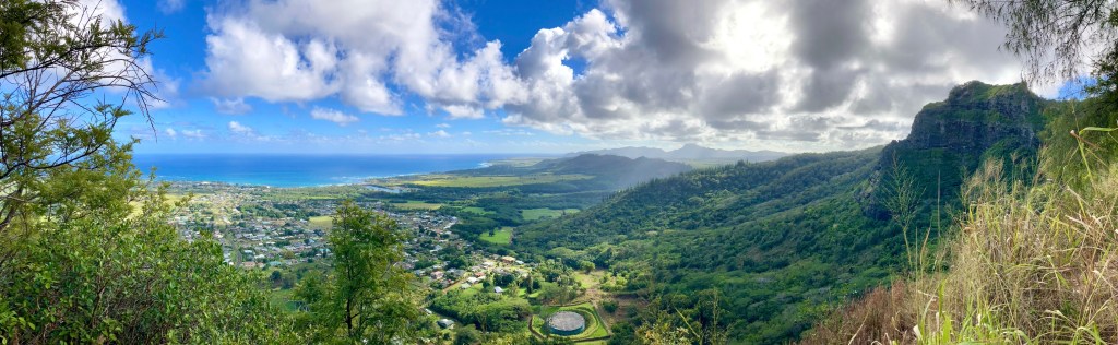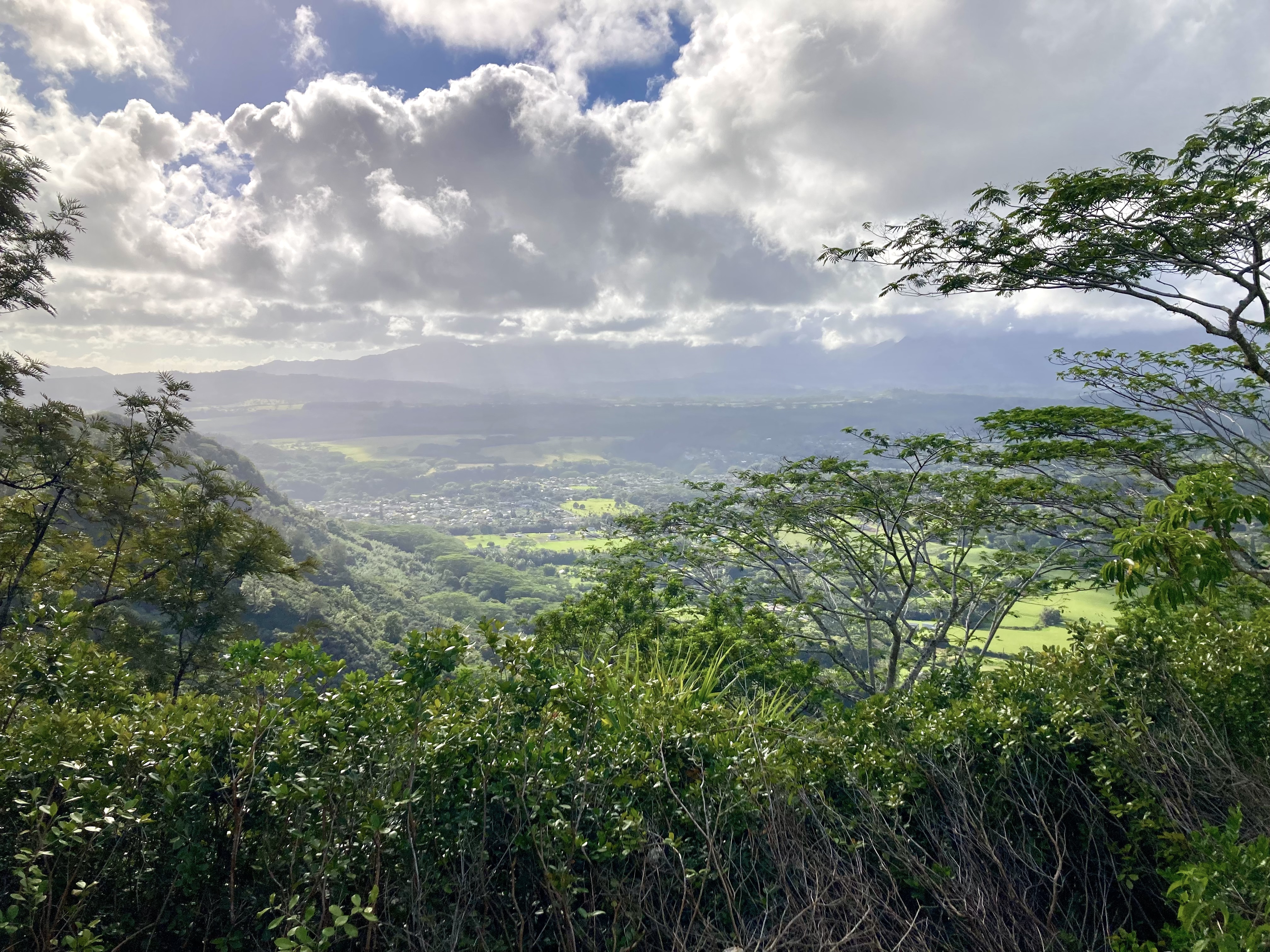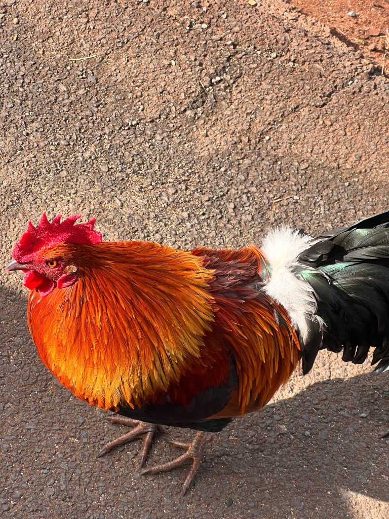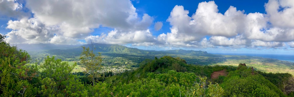 Next up was a hike. This was one of the main reasons for us to come to Kaua’i. Chelly has become quite the avid hiker in recent years, and I have always been. I was born hiking. Anyway, Kaua’i is well known for trails and mountains and waterfalls and such, and we thought we’d do a bunch on this trip. Here it was day 4 already and we hadn’t done one, so I Googled “hiking trails near me” and found a close one called “The Sleeping Giant”. The Sleeping Giant is the lonely steep-sided peak of an isolated mountain ridge. It’s not too high, but looks dramatic, and has breathtaking views. The proper Hawaiian name for the place is Nounou. We parked at the Nounou East trailhead and headed up, passing loads of wild chickens on the way. Wild chickens are a thing here. Kaua’i is known for them. I heard a legend that they escaped from someone’s farm long ago, and in the absence of natural predators, they have multiplied and spread across the island. I bet that’s a great thing for hungry and homeless people; there’s always some easy food running around in both the town and the forest.