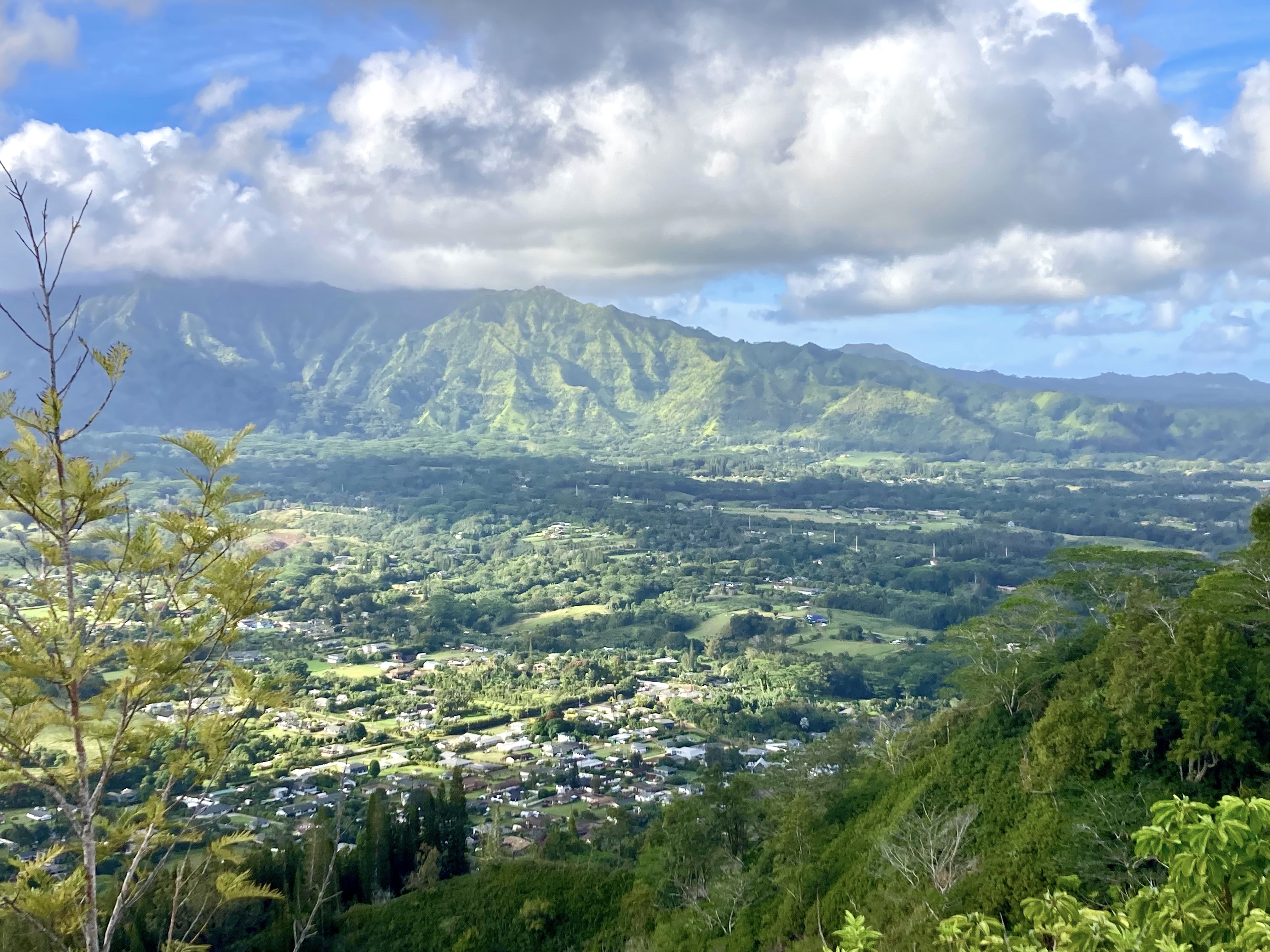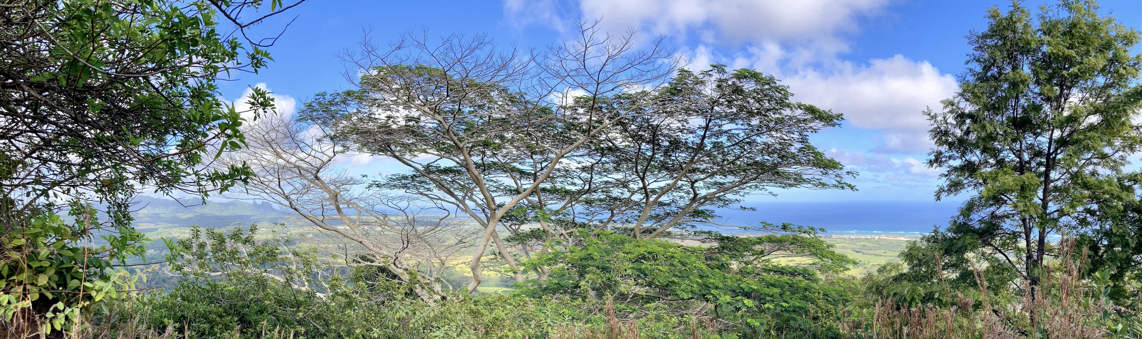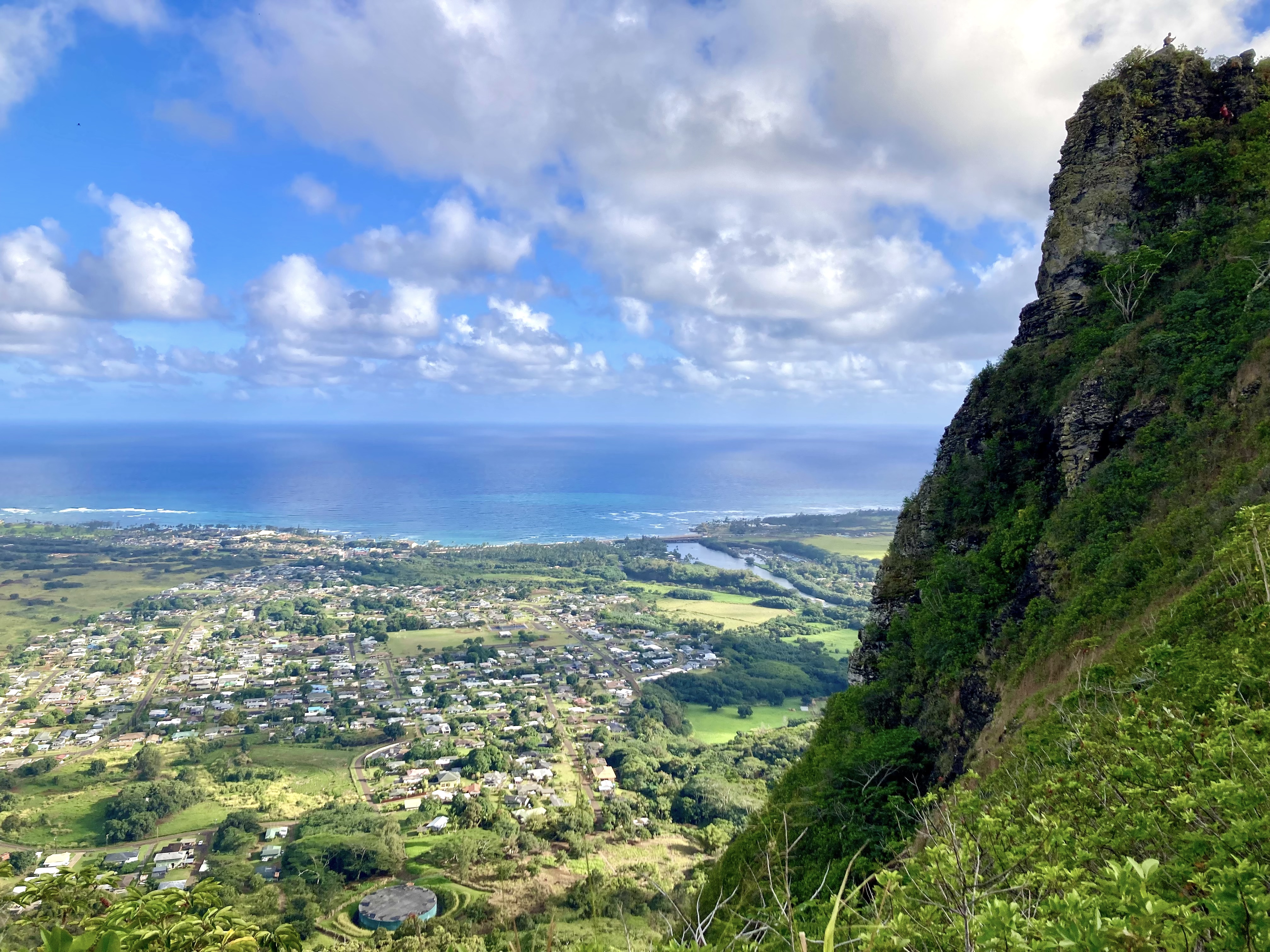 Next up was a hike. This was one of the main reasons for us to come to Kaua’i. Chelly has become quite the avid hiker in recent years, and I have always been. I was born hiking. Anyway, Kaua’i is well known for trails and mountains and waterfalls and such, and we thought we’d do a bunch on this trip. Here it was day 4 already and we hadn’t done one, so I Googled “hiking trails near me” and found a close one called “The Sleeping Giant”. The Sleeping Giant is the lonely steep-sided peak of an isolated mountain ridge. It’s not too high, but looks dramatic, and has breathtaking views. The proper Hawaiian name for the place is Nounou. We parked at the Nounou East trailhead and headed up, passing loads of wild chickens on the way. Wild chickens are a thing here. Kaua’i is known for them. I heard a legend that they escaped from someone’s farm long ago, and in the absence of natural predators, they have multiplied and spread across the island. I bet that’s a great thing for hungry and homeless people; there’s always some easy food running around in both the town and the forest.