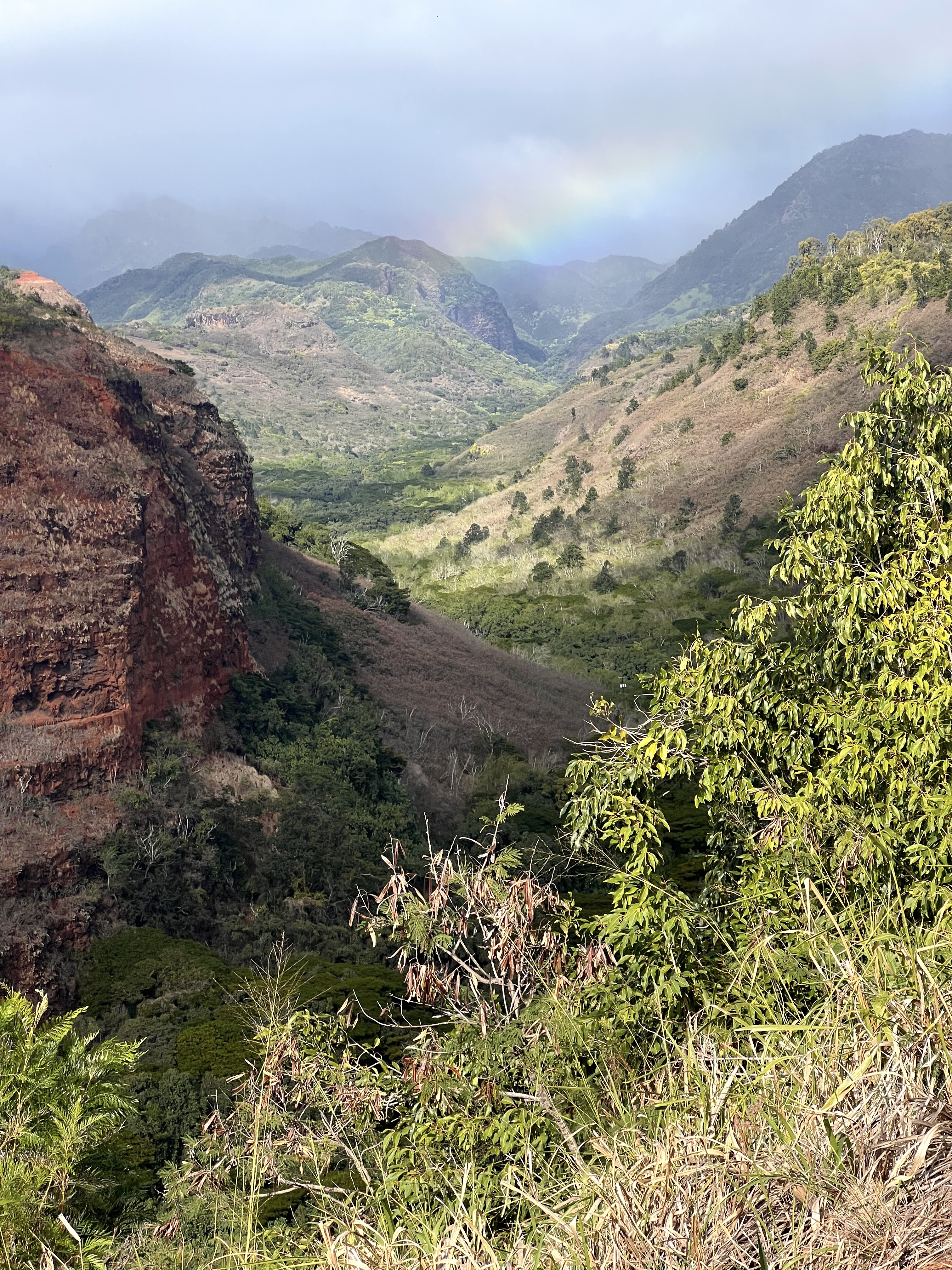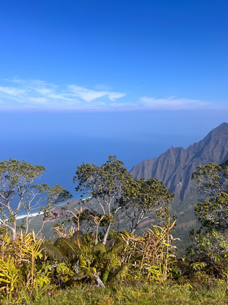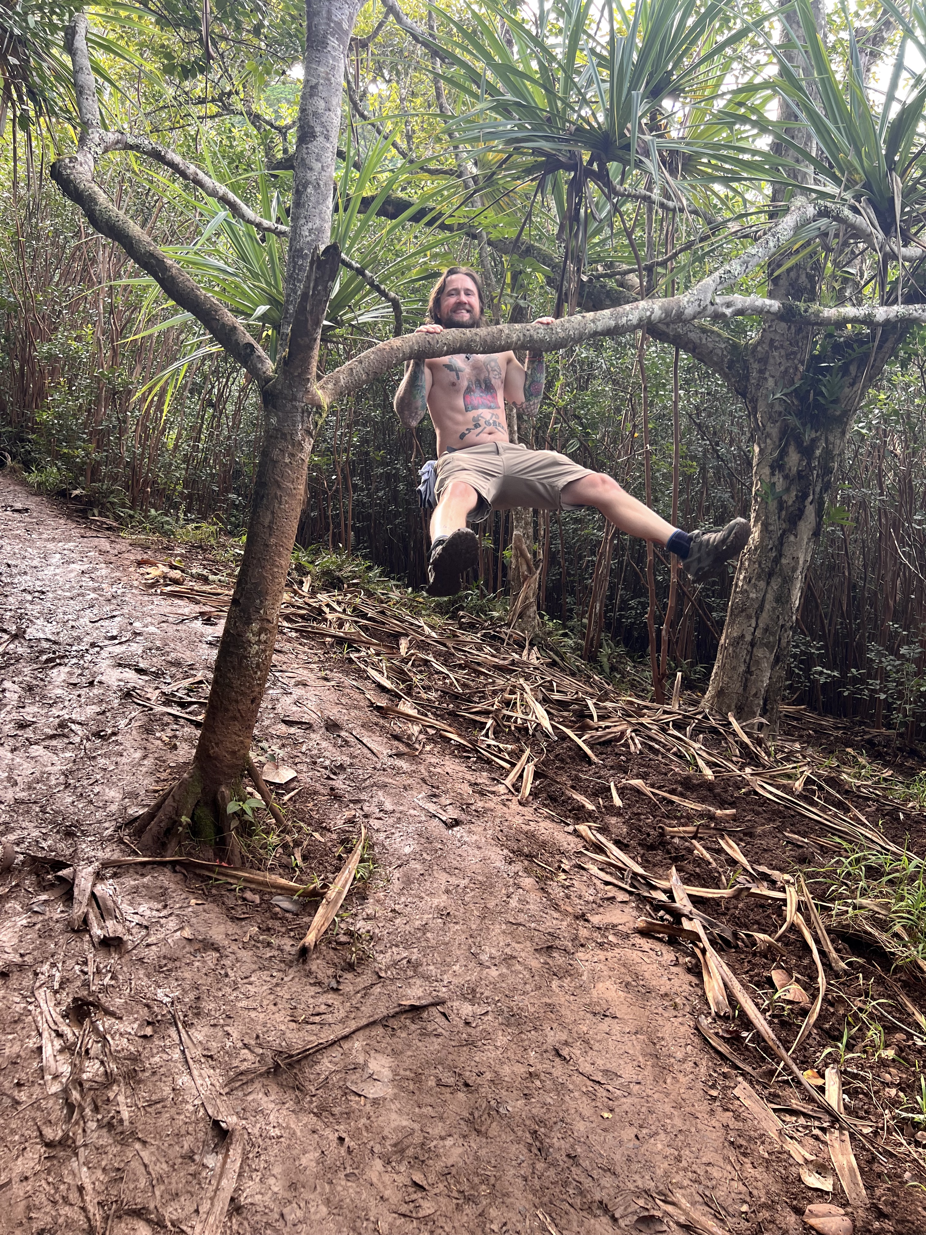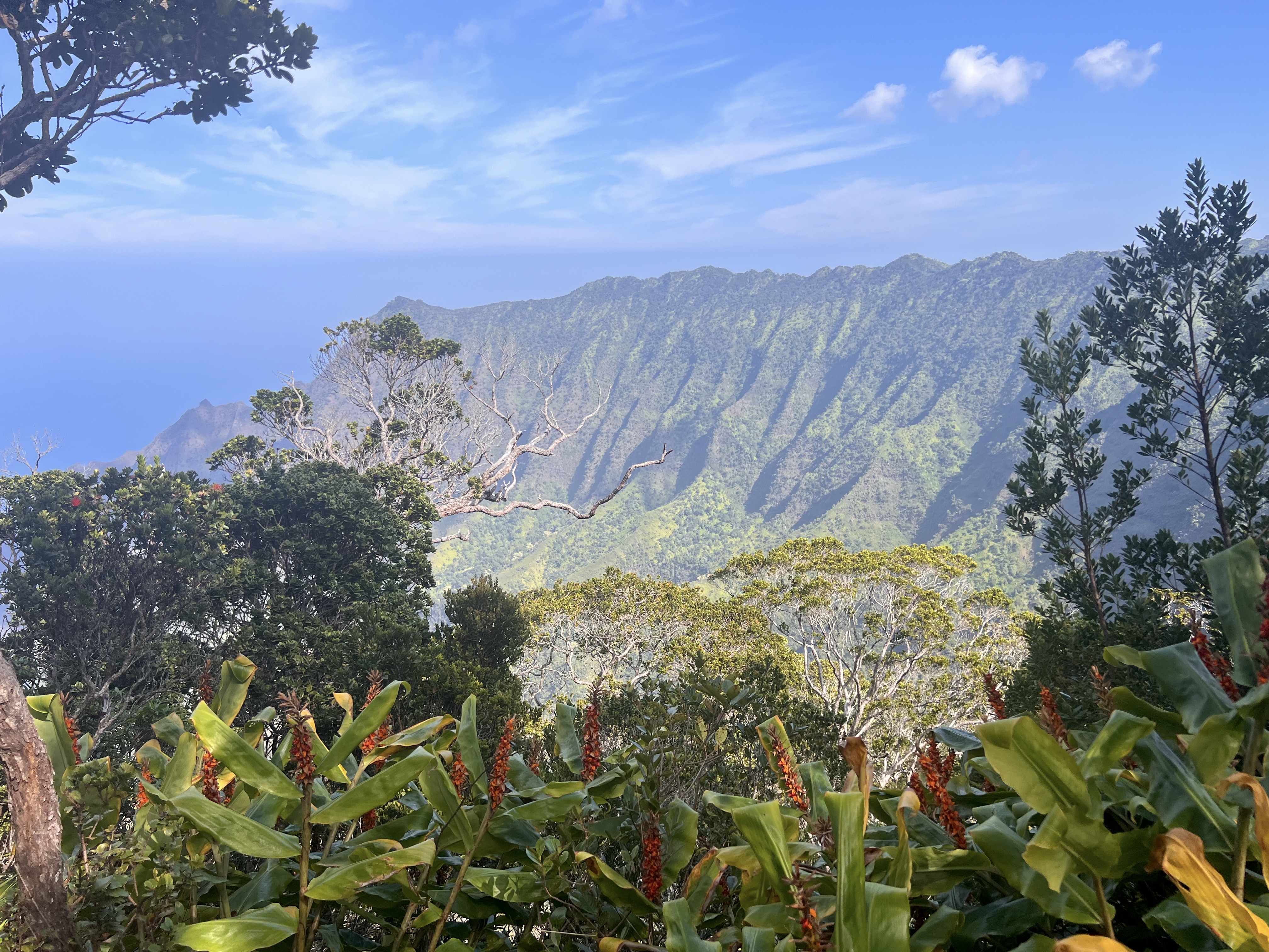 Saturday, January 4th, 2025. This day started with another drive out towards Waimea. This time we headed up the winding, narrow road with stunning views of Waimea Canyon on our right, leading towards the numerous state parks and wilderness areas of Na Pali. We skipped breakfast and drove all the way to the end of the Kokee Road, to the Kalalau Lookout, where hiking trails led into the intricately formed volcanic valleys of the Na Pali Coast. After checking out the views from the top, we “hiked” along the closed section of road towards Pu’u O Kila Lookout. I say “hiked” in quotation marks because I don’t think walking on a paved road is truly hiking. But, it was beautiful and serene. I also took a few side trails to get into the jungle and really experience it. On one of those side trails, Chelly took a picture of a cool fairy house that someone had left there in the woods.