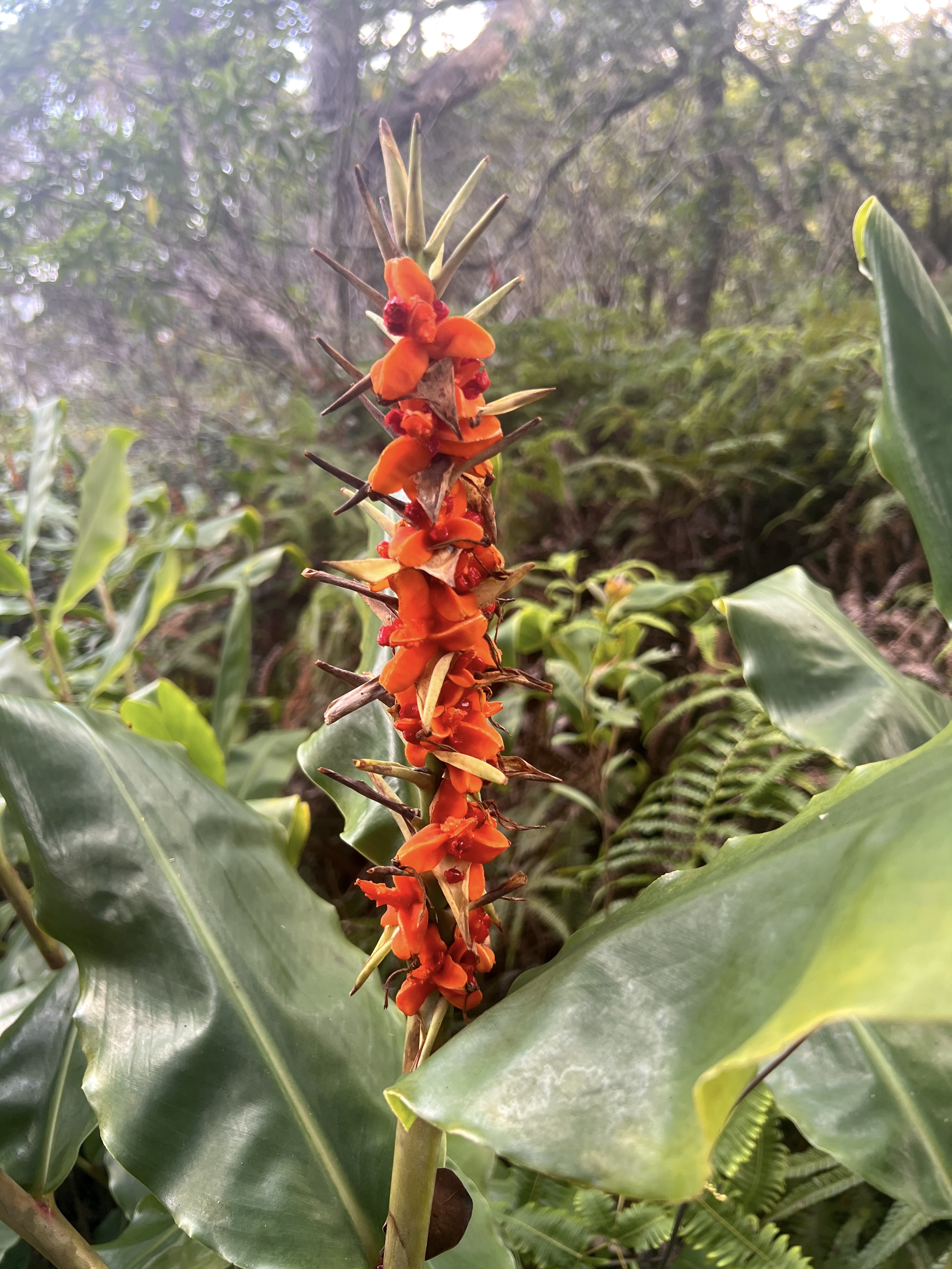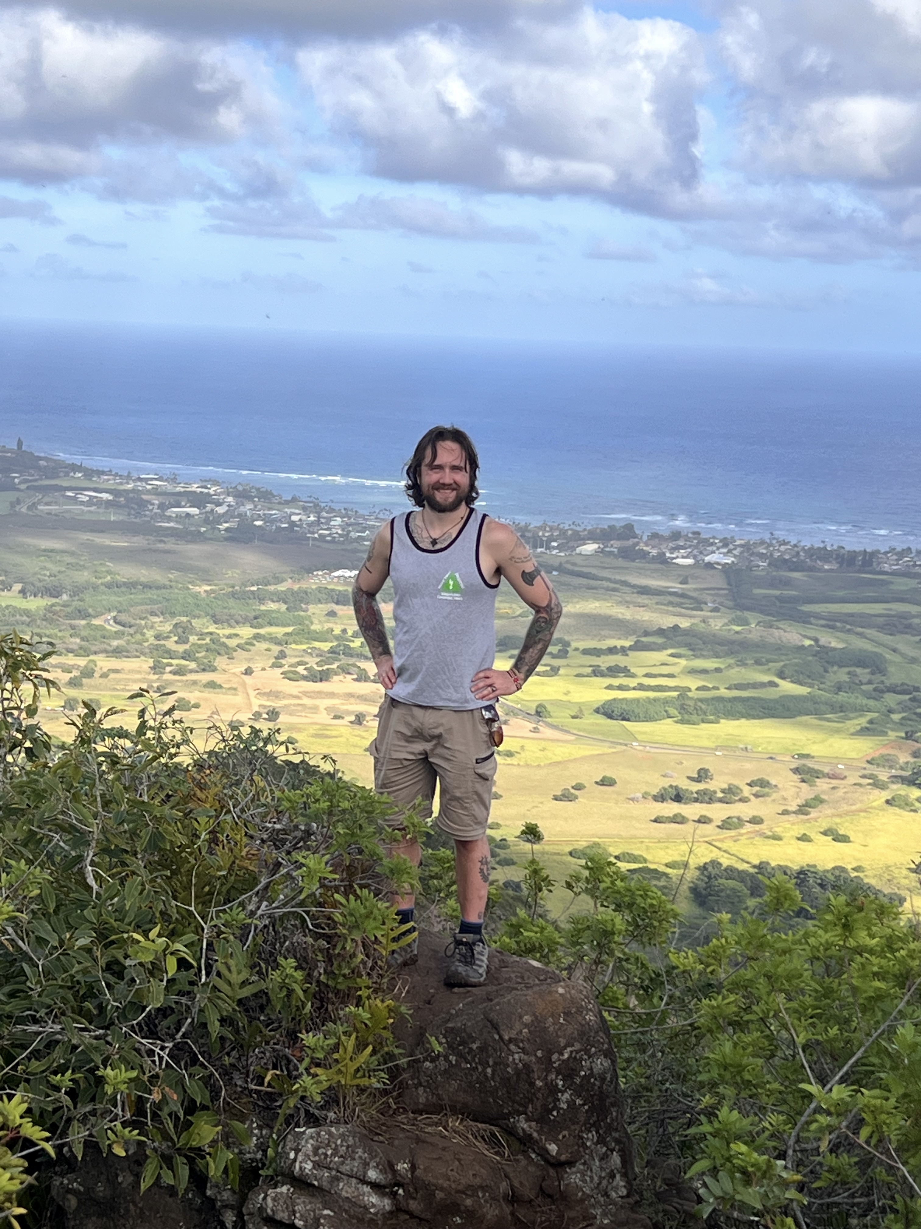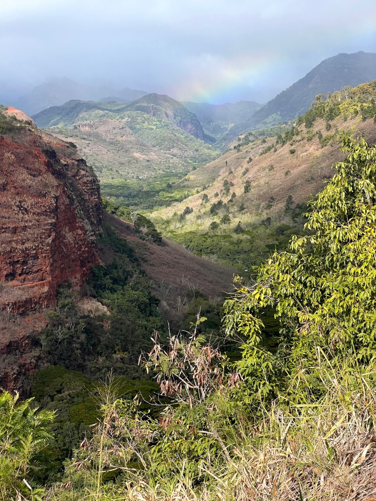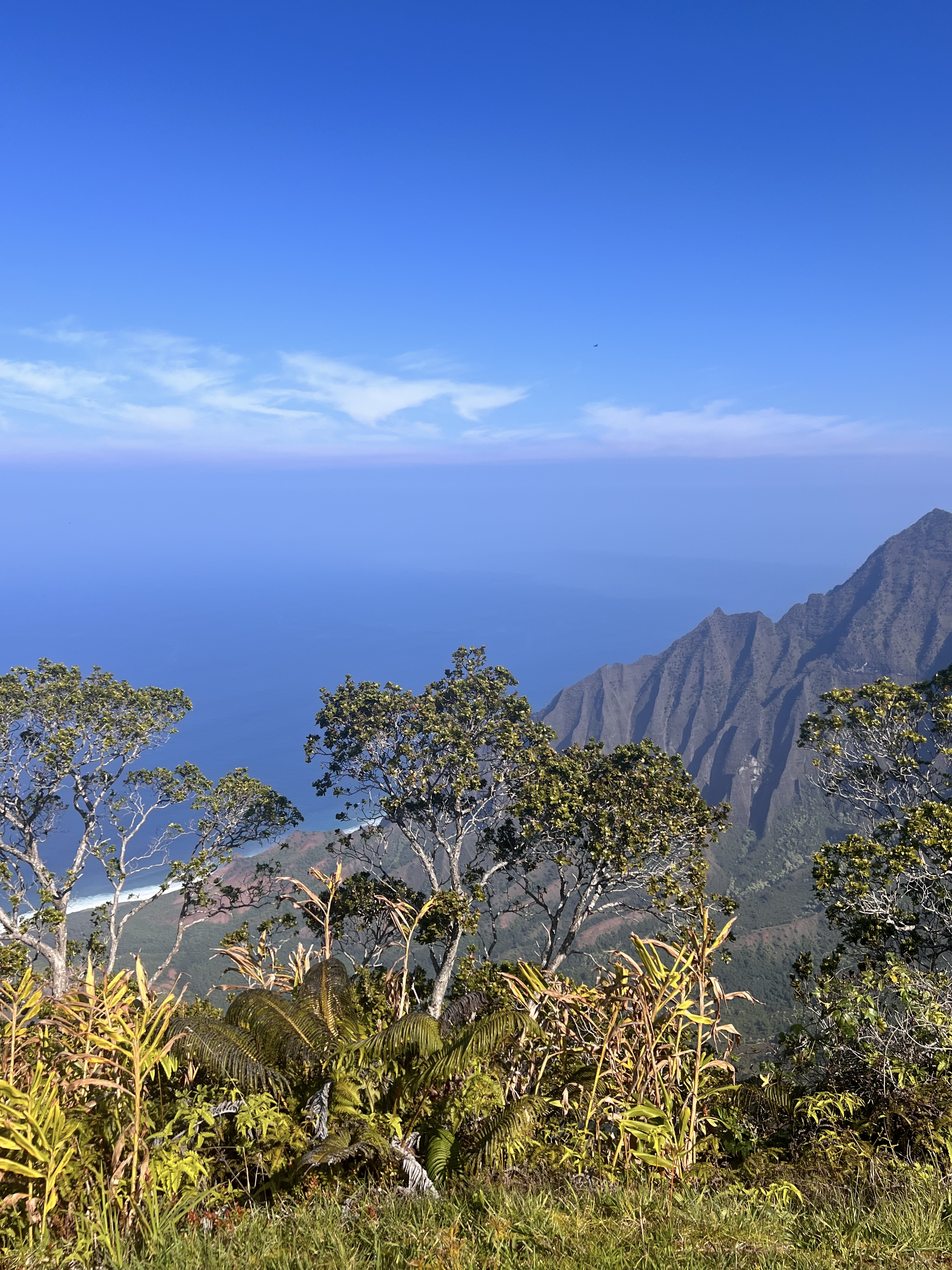 Saturday, January 4th, 2025. This day started with another drive out towards Waimea. This time we headed up the winding, narrow road with stunning views of Waimea Canyon on our right, leading towards the numerous state parks and wilderness areas of Na Pali. We skipped breakfast and drove all the way to the end of the Kokee Road, to the Kalalau Lookout, where hiking trails led into the intricately formed volcanic valleys of the Na Pali Coast. After checking out the views from the top, we “hiked” along the closed section of road towards Pu’u O Kila Lookout. I say “hiked” in quotation marks because I don’t think walking on a paved road is truly hiking. But, it was beautiful and serene. I also took a few side trails to get into the jungle and really experience it. On one of those side trails, Chelly took a picture of a cool fairy house that someone had left there in the woods.