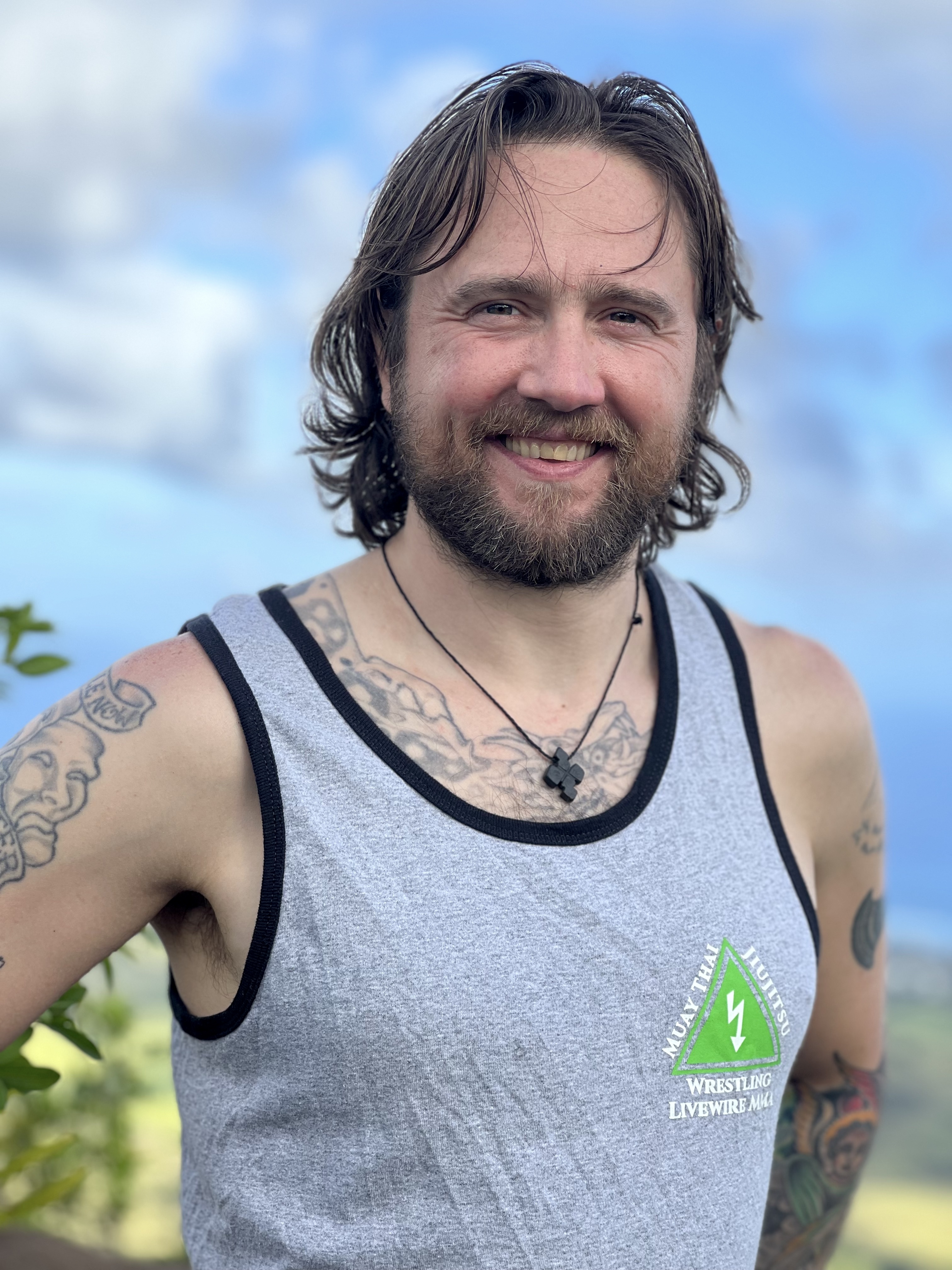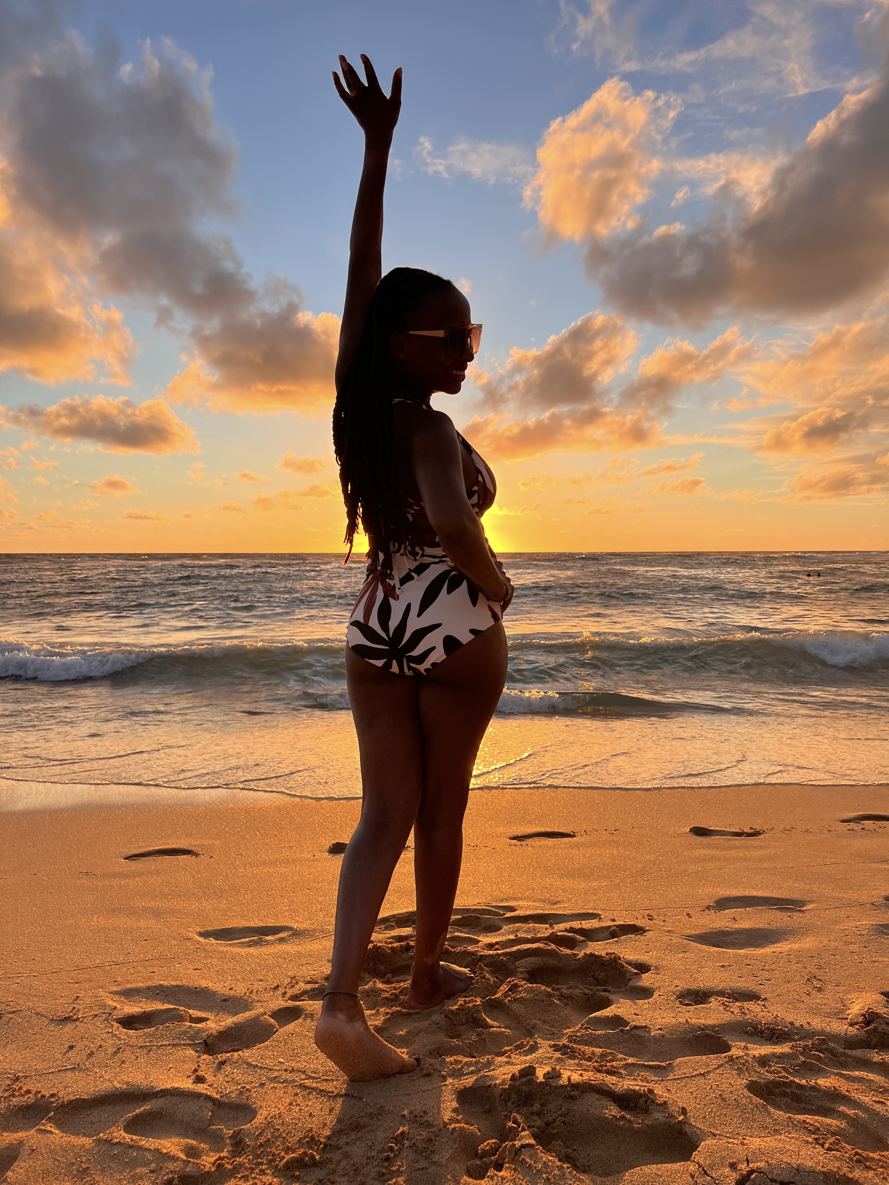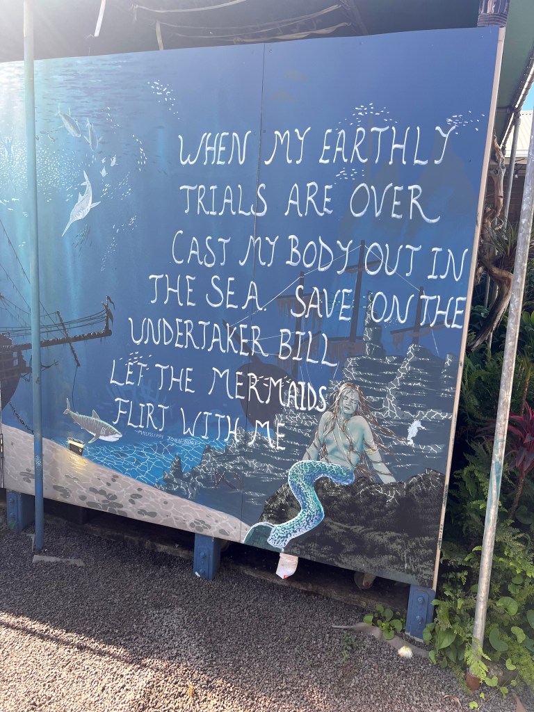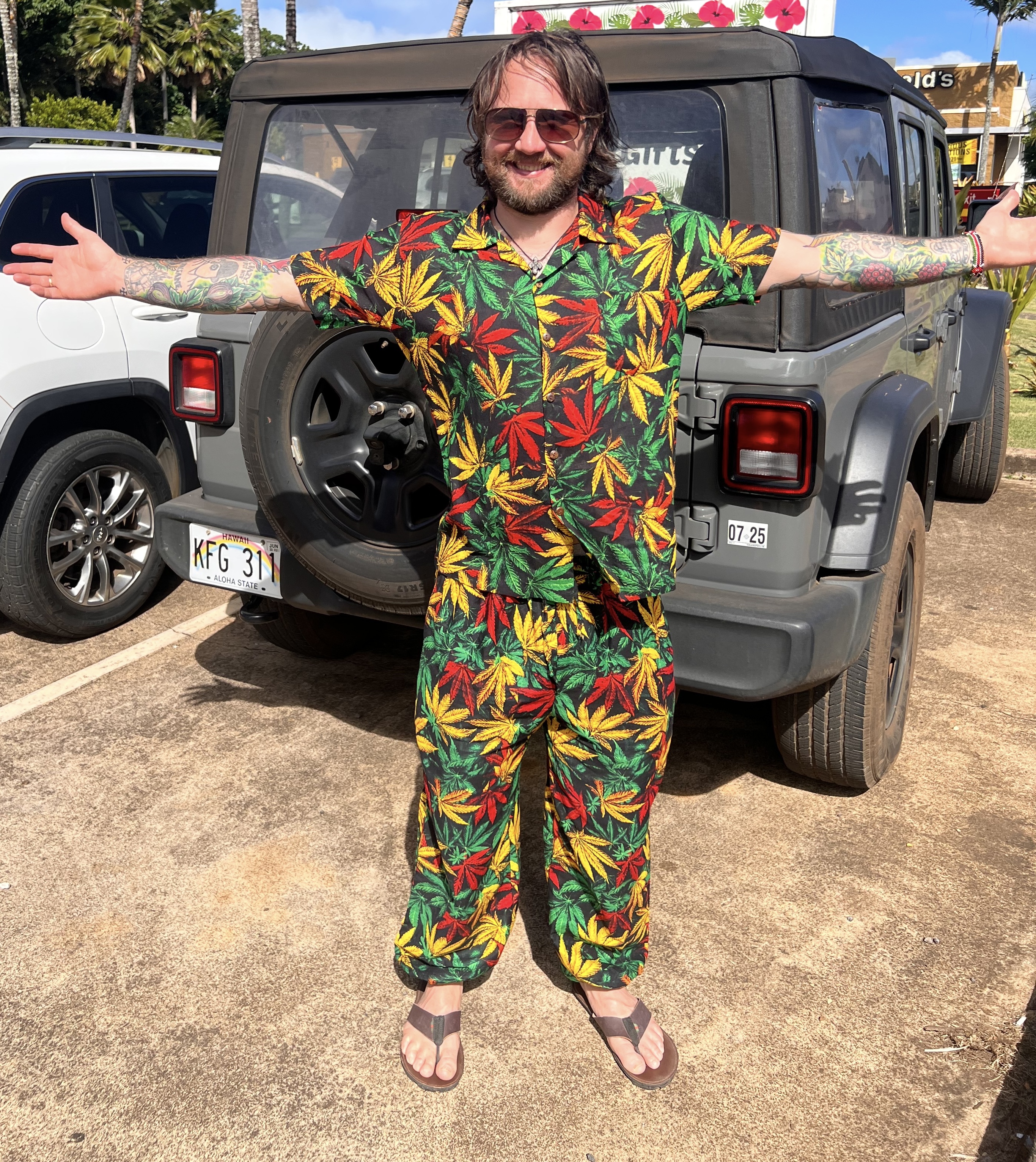 Monday, January 6th, 2025. We started the day with a little morning Yoga. Chelly has a Yoga group and sometimes they do live classes, but with the 2-hour time difference, she was never up early enough to join them on this trip. Instead, she did pre-recorded sessions from the website. While she was doing one of those up in the room, I went down to the grass near the beach to do my sun salutations and a few other things. Then we went souvenir shopping. That was a big project, but not much to talk about. We bought some interesting fabrics for my mother (the quilter), and a variety of things for Dad, the boys, and Bibi (Chelly’s mom). The highlight of the day for me was stepping out in my 2-piece “Ganja Suit”: matching pants and shirt, black background, with an almost camouflage pattern of red, gold, and green ganja leaves all over. Chelly thought I looked ridiculous, but I got a lot of compliments, especially from the older local women, who kept asking me where to get the real stuff. But, I don’t know, because I’m not from this island! The Filipino grandma at the souvenir shop taught me how to say “Pakalolo”, the Hawaiian word for Ganja. And there was ONE younger lady who beeped her horn and shouted out the window, “I love your outfit!” I told Chelly about it because I thought it would make her jealous, but it didn’t work.