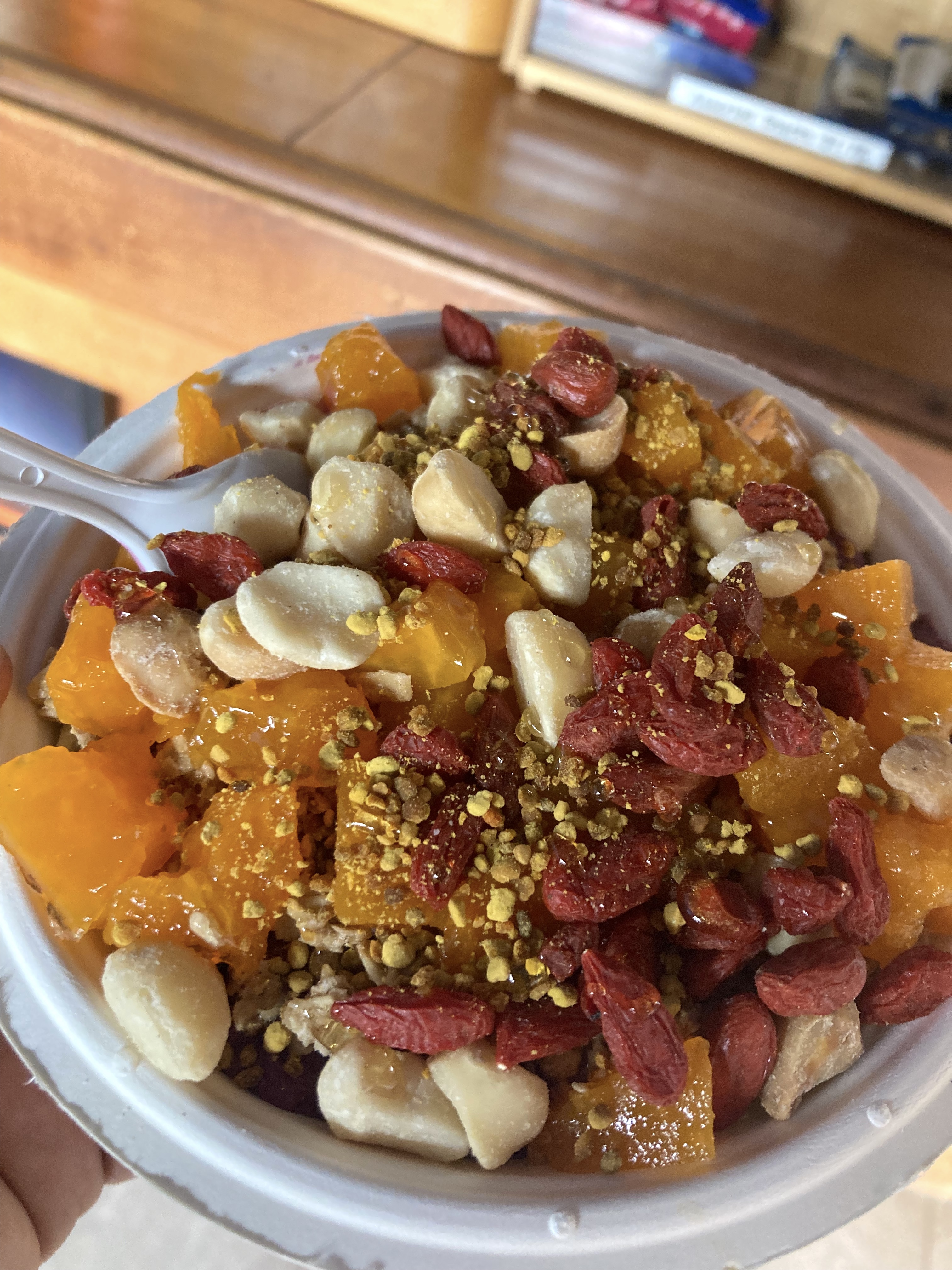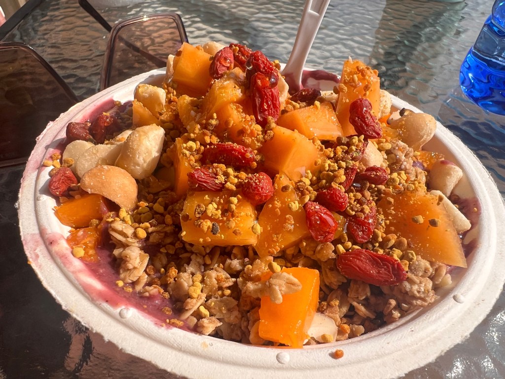 Tuesday, January 7th, 2025. We woke up that morning with no time for workouts, or beaches, no pool, no hot tub, and no breakfast spots. We just had to quickly pack our bags, get ourselves together, take out the trash, bring the jeep around, load it up, and check out. But, we still had the whole day to enjoy Kaua’i because our checkout time was 10am and the flight wasn’t until 10:30pm. So, we headed North, visiting a waterfall, some special viewpoints, and more beaches on our way towards Hanalei. We were looking for an Acai bowl to eat for late breakfast, but stopped at place after place just to find that all the Acai bowl spots on this side of the island were closed today. We even got a hot tip on the best Acai place around, and it was closed too. We did finally get that Acai bowls, all the way in Hanalei, but it was underwhelming and nowhere near as special as the ones from G’s Juicebar in Waimea. But, you know what? It was still a delicious and healthy treat and we enjoyed it.