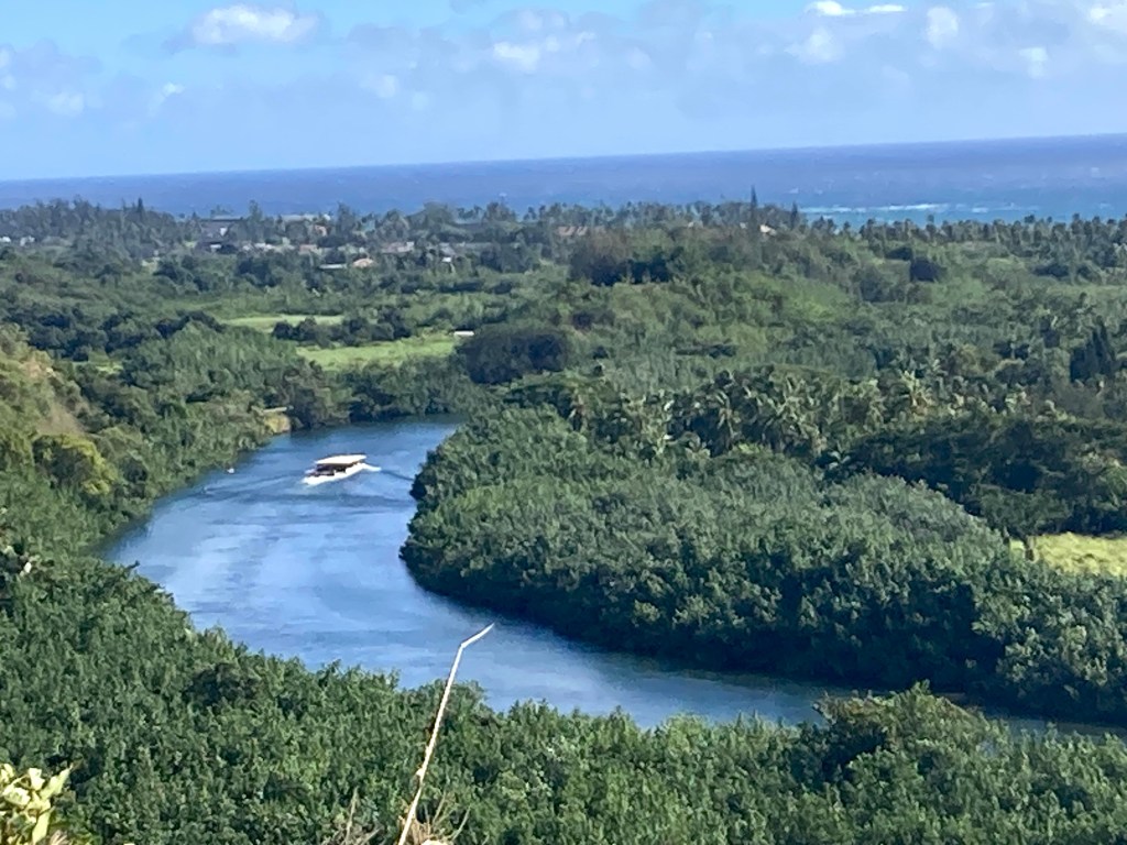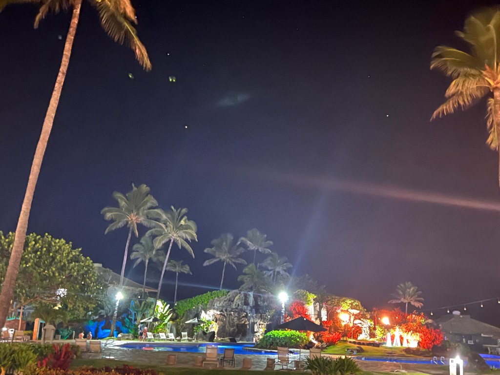 At the far end of that dark and lonely road, about an hour from our hotel, we finally got to the charming little town of Hanalei, where almost everything was closed. But then I found a spectacular Tapas place called Bar Cuda and we had one of the two best meals of the trip (my other top restaurant was Japanese Grandma in Hanapepe). There was an appetizer with honeycomb and blue cheese, a zatar lamb lollipop dish, and coconut ice cream in a magic chocolate shell. It was excellent and my chef wife was pleased. From there, we drove an hour and a half back down to the South end of the island, looking for a fireworks show we’d heard about at Poipu Beach. When we got there, we discovered that the fireworks show was canceled this year. No worries. We found a DJ party around the corner at a nearby hotel bar where the DJ played a wide variety of tunes, everything from trashy EDM to early 2000s Top 40, hip-hop hits, and some of the Reggae music that we love. The DJ was way too drunk and he kept breaking out in “freestyles” that were really just profanity-laden rants with a mild sense of rhythm. It was pretty funny, actually. One of the most amusing moments of the night, for me, was when an intoxicated woman near the bathrooms told me, “only you could pull that off,” commenting on my floral print getup from Thailand, then berated me when I tried to help her find the ladies room. The party was a blast, spirits were high, and we met a few cool new people as Chelly and I ushered in our 17th wedding anniversary.