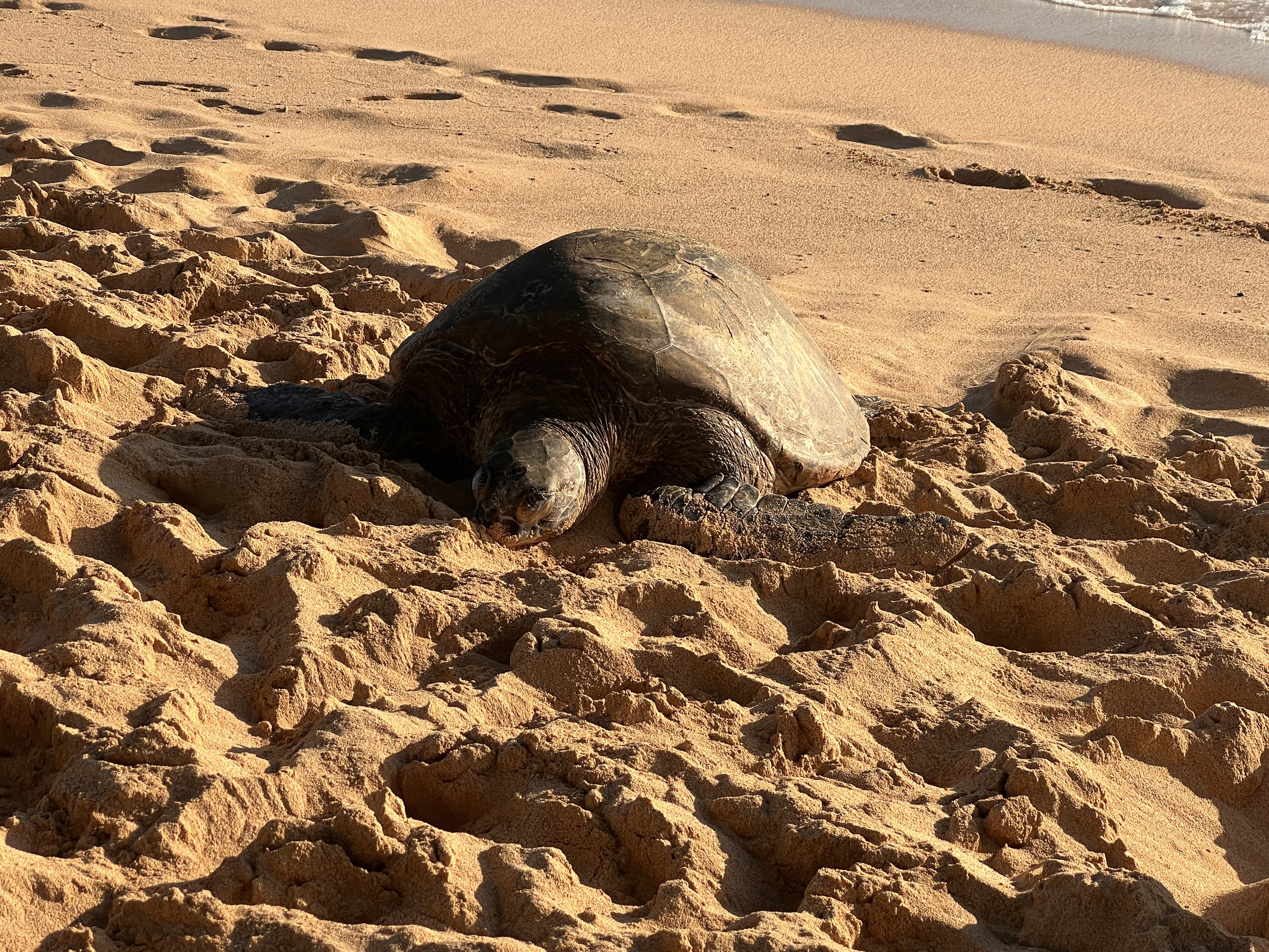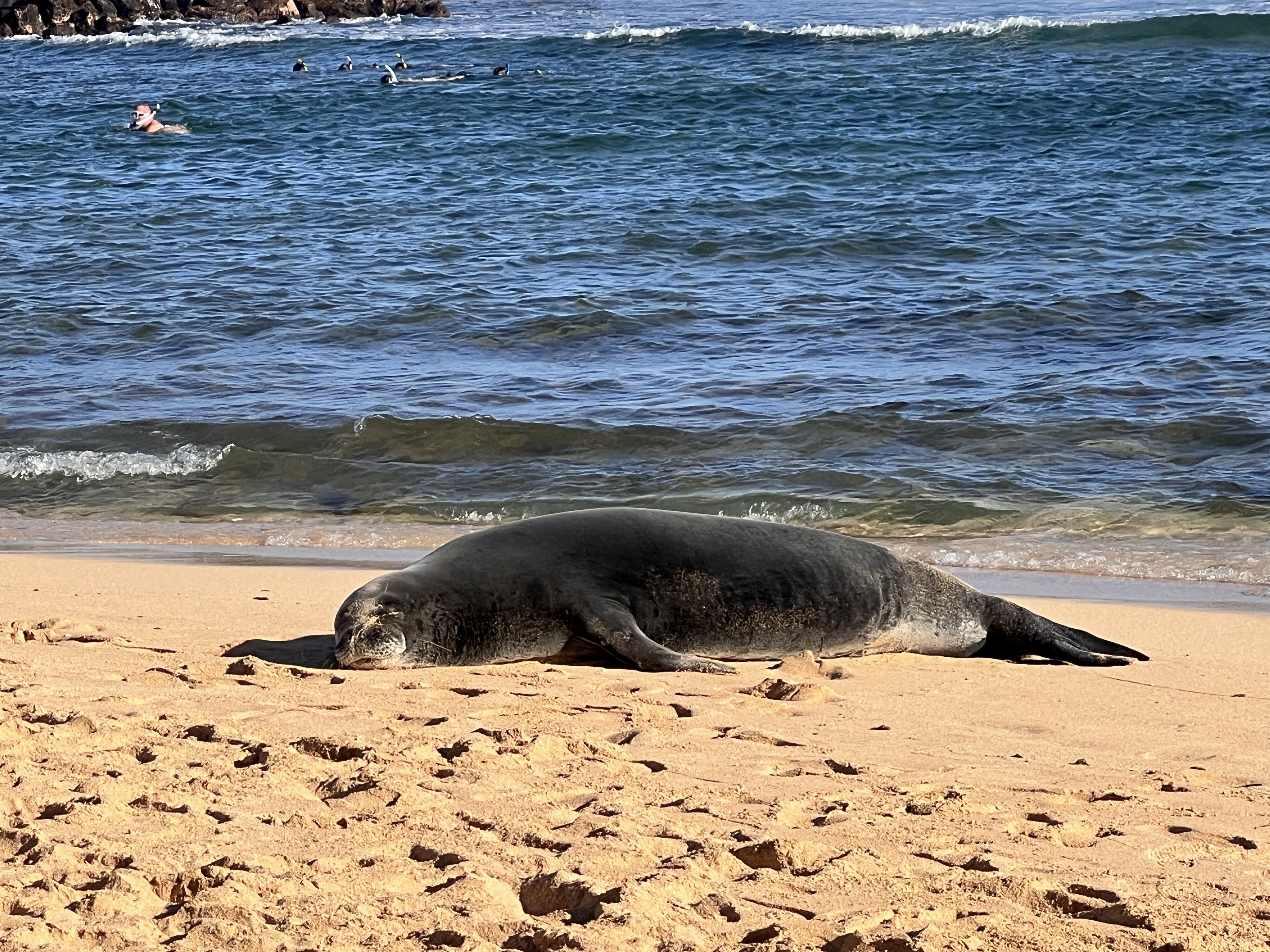 Poipu was something else, wholly different than most of the other places we visited on the island. It was basically a colony of the mainland USA. Everything there looked like it could have been in Sun City, Arizona, or Redmond, Washington. It was cul de sac developments built around golf courses, with brick signs at the entrances bearing names like “Bayview” and “Crestview”. A sanitized Anglo-American Hawaii for the retirees. Parking by the beach was hard to find, and the beach itself was absolutely the most crowded that we saw anywhere on Kaua’i. Not that it was the best beach, but it wasn’t bad either. There was a cool little island, accessible by land bridge at low tides, but I didn’t get to go out there because there were a couple of sea turtles sleeping on the island and the lifeguards were keeping careful watch over the animals. That was one of the special attractions of this beach. Despite being small and crowded and lined with homes and resorts, it was also a home for local wildlife (there was a monk seal sleeping on the beach near us, and another sea turtle just a little ways down), and the site of the most spectacular sunset view.
