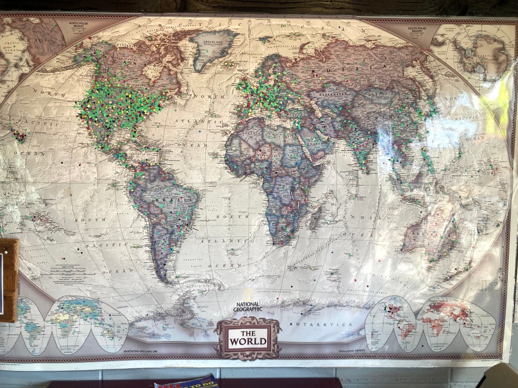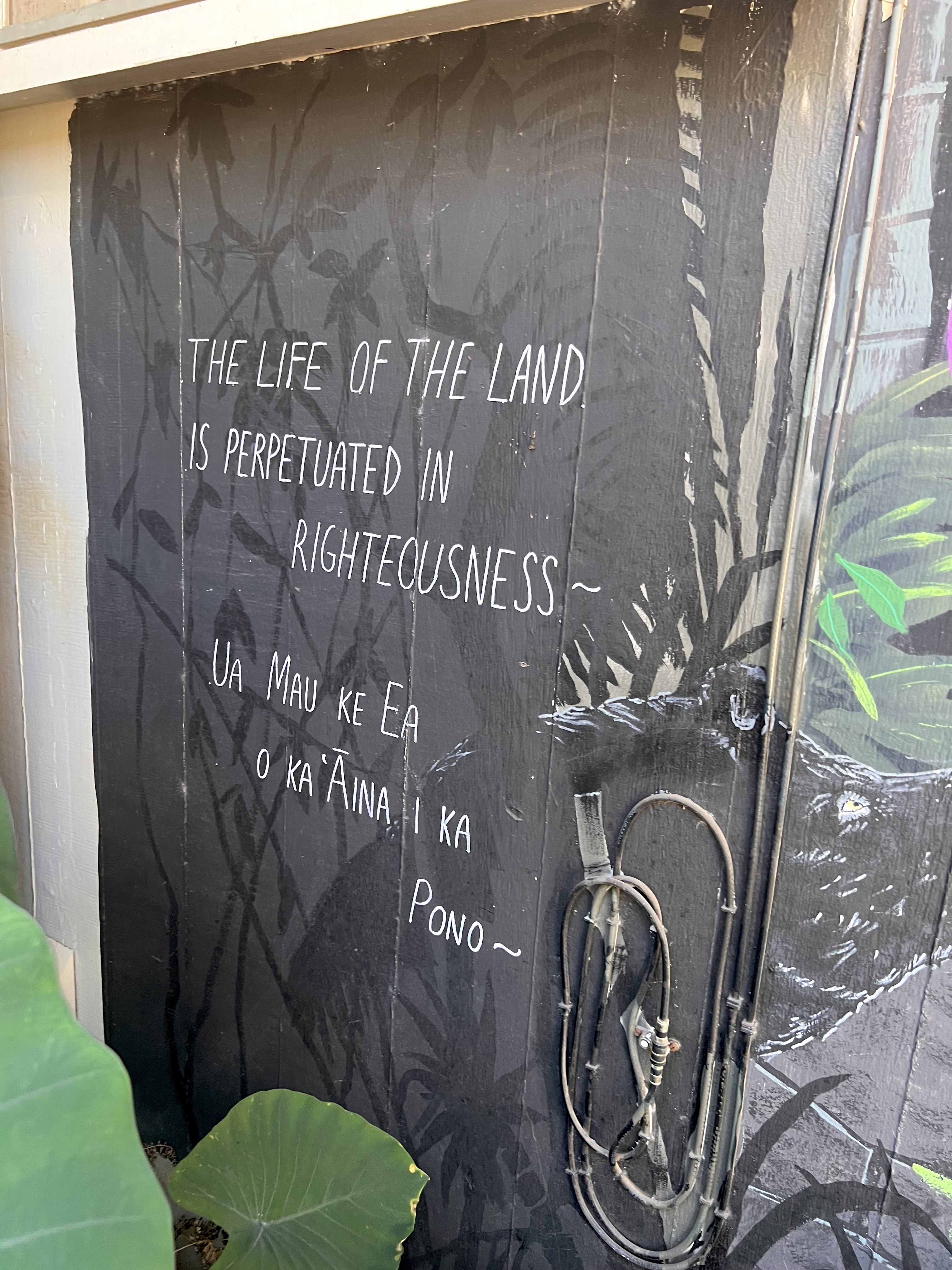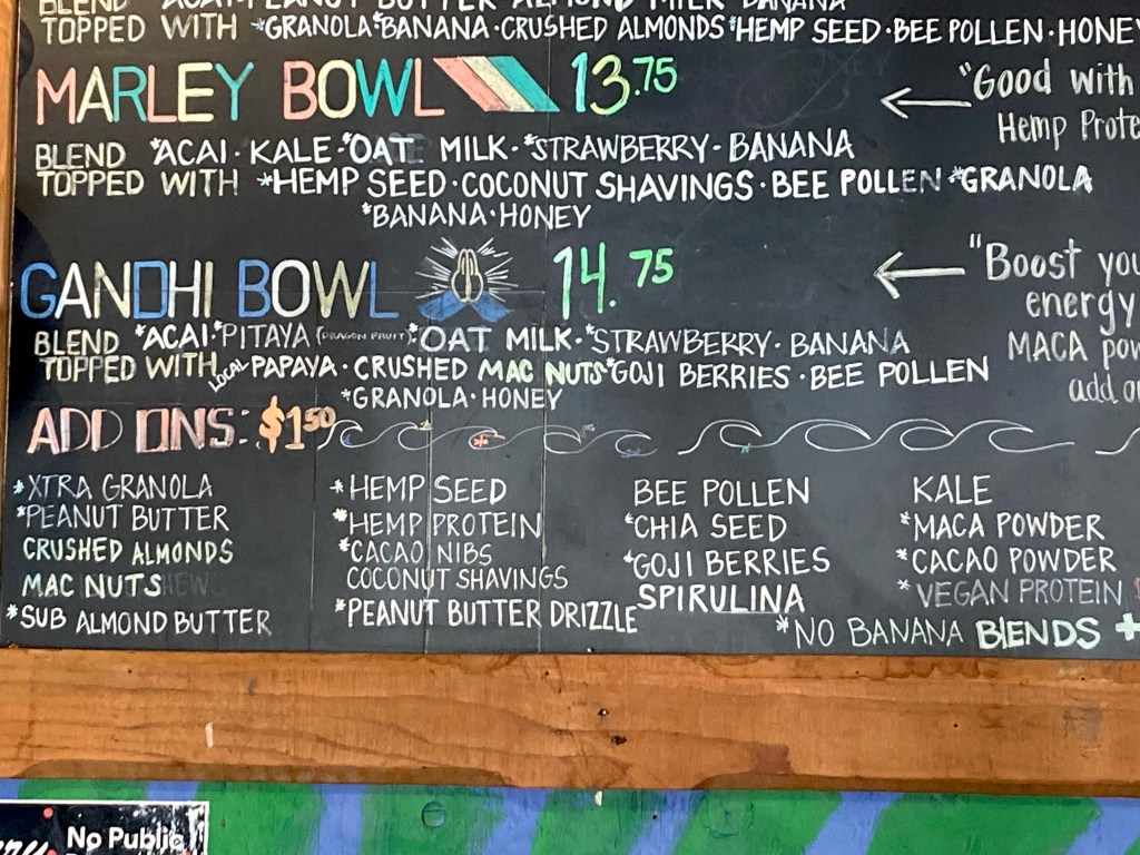 Hawaiians call them “Juice Hale” (juice house), and this was the coolest one we found on the island: G’s Juicebar. They had an awesome menu of Acai bowls and smoothies, fresh juices, and more. The music was all classic Jamaican Reggae and heavy Jahwaiian, the stuff with fat bass lines and Hawaiian language chants. I loved it and I loved the “Gandhi Bowl” that I got there, one of the most delicious things I had on the entire trip, and honestly something I would have eaten for breakfast every day if it wasn’t such a long drive from home base. In a gesture of Hawaii’s love for Bob Marley and all things Rastafari, they had a “Marley Bowl” on the menu and a Bob quote up on the wall. The owner and I made nice conversation about that and he told me about the Rastas he’d seen in Japan and how popular Reggae was over there. So, I filled him in on Haile Selassie I’s outspoken respect for Japan, the Japanese garden he’d built at the palace in Addis Ababa, and Bob Marley’s massive concerts there in the 1970s. Also on the wall was a map of the world with little stickers to show where the visitors came from. Most were from the continental USA and Europe, but there were plenty from Philippines and India, Mexico and the Caribbean, and many parts of Africa. I put the first sticker down on Mombasa for Chelly’s sake.