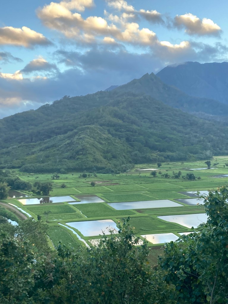 Outside the Church was the Kapaia suspension bridge. We found it by accident. There was a little trail leading off through the jungle and I think I saw a chicken go down that way, so instead of heading to the truck, we went and checked that out. It was very cool, and at the other end was a little monument with a photo of the same area 100 years ago. Fascinating. What is a sleepy residential neighborhood today was the center of commerce for a small community back then. The Catholic Church and the Buddhist Temple are the only two structures still standing from the time. And the trees have grown up massively. After that I went to buy some boxer briefs (I hadn’t packed enough for the whole trip), and then we stopped at a place called Red Eye Snack Shack for a serious Hawaiian breakfast. We got some Poke that was out of this world, and I got to eat Loco Moco for the first time in my life because they had a gluten-free gravy. Happy times. We changed our clothes quickly and headed North to spend the rest of the day in Hanalei.